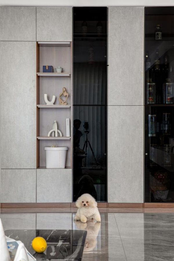 入户左手边是一整面墙的玄关柜,衣服鞋包藏起来,展现在外的是素色淡雅的雕塑摆件,透出繁杂聒噪生活中的那一份宁静与舒适。