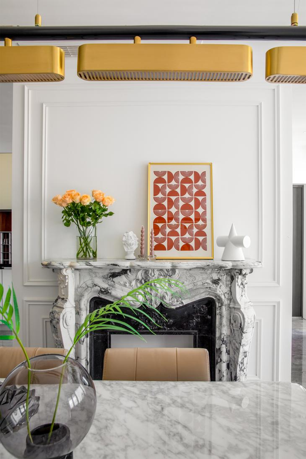 石膏线条的背景墙,线条利落,墙面层次更加丰富立体,经典的法式壁炉、大理石餐桌、热情艺术的挂画和绿植,是精致浪漫的雕刻,体现低调的复古奢华。