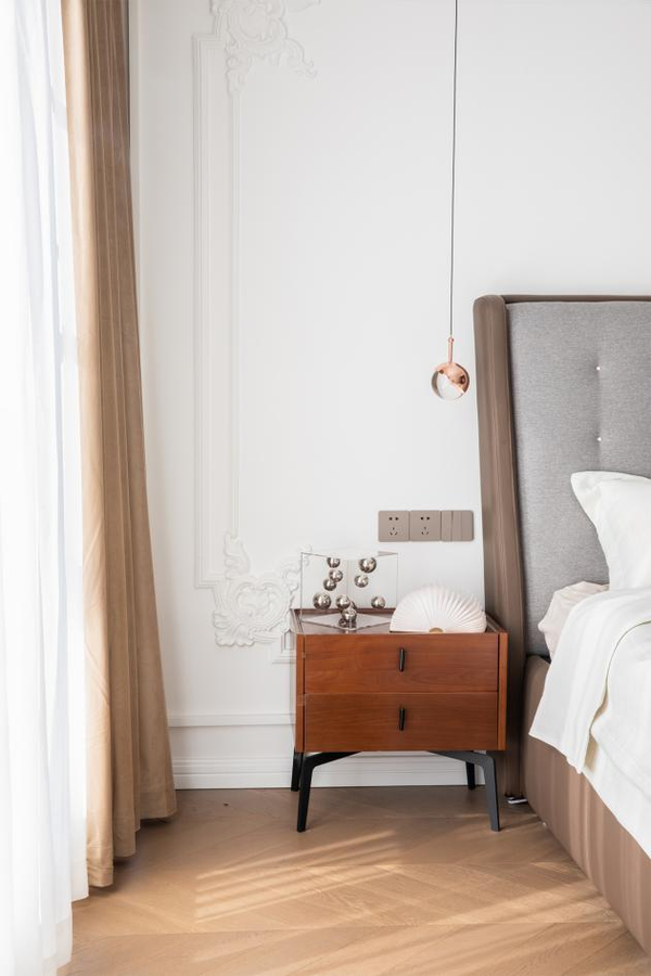 细节处的法式雕刻让墙面更有质感,独特设计的床头柜温润小巧,即使在角落摆放也是让人百看不厌的居家艺术品。