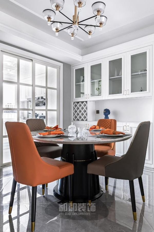 客餐厅一体化,硬装选择了灰白调为基调,为软装的设计释放更大的能量,橄榄绿优雅复古,珊瑚橘暖意温馨,冷暖色调的和谐过渡拉出视觉的层次感,整体空间呈现出自然沉稳而不失高级的气场。