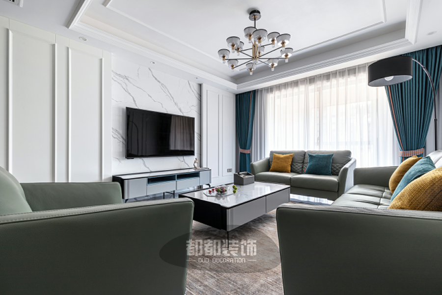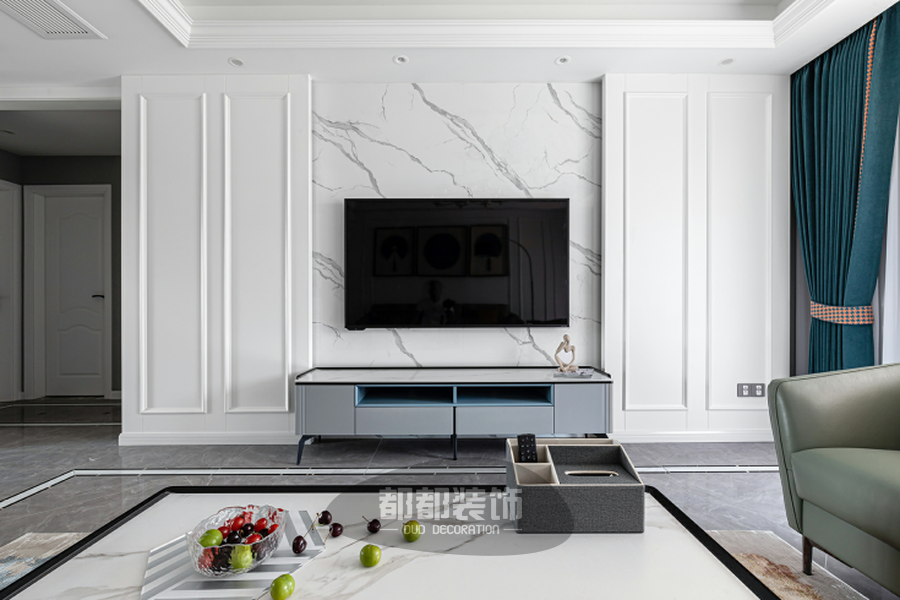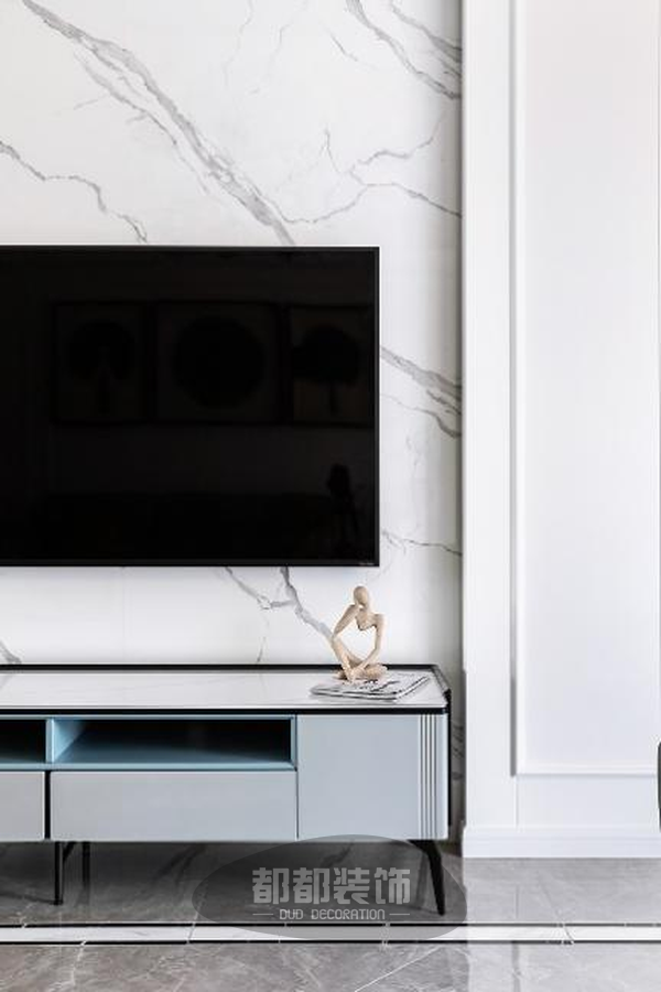 电视墙背景墙采用大理石,纹理自然,简洁大方,勾勒出独特的空间气质,两侧配以对称凸出的石膏线条,让整体墙面造型更显立体轻奢。