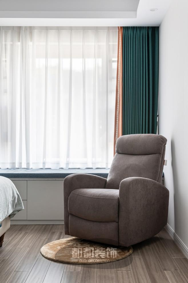 飘窗是家里一个惬意又美好的小角落,设计师特意放置了深色单人沙发,简单纯粹的外形每一处都在为享受而设计。选个很温柔的天气,将自己陷进柔软的靠背中,品茗读书,感受着和煦的阳光洒满全身,这一刻就是幸福。
