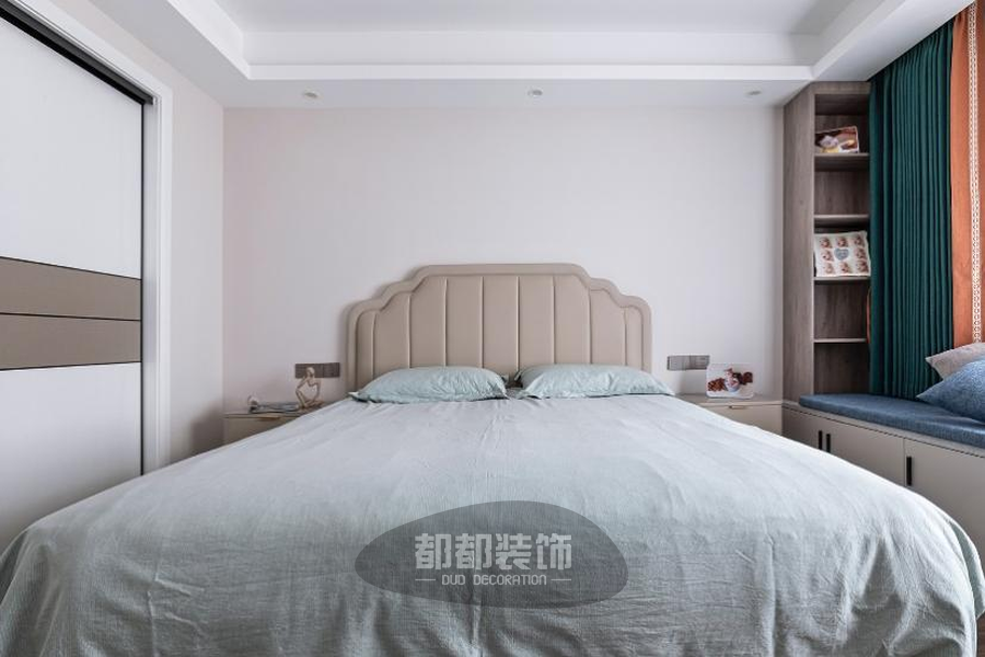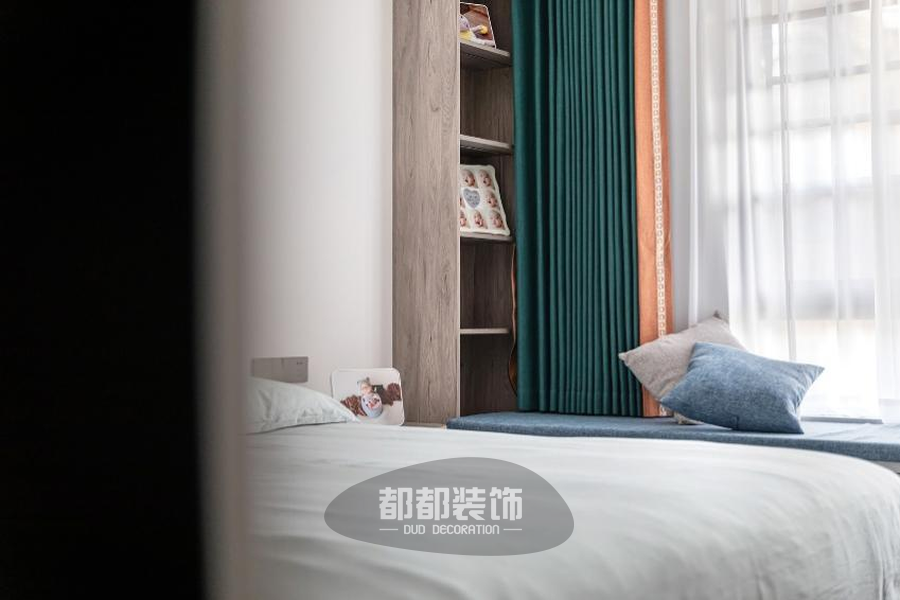 飘窗一侧靠墙做了一个到顶书柜,不管是摆放一些书籍还是具有纪念意义的照片,生活气息十足