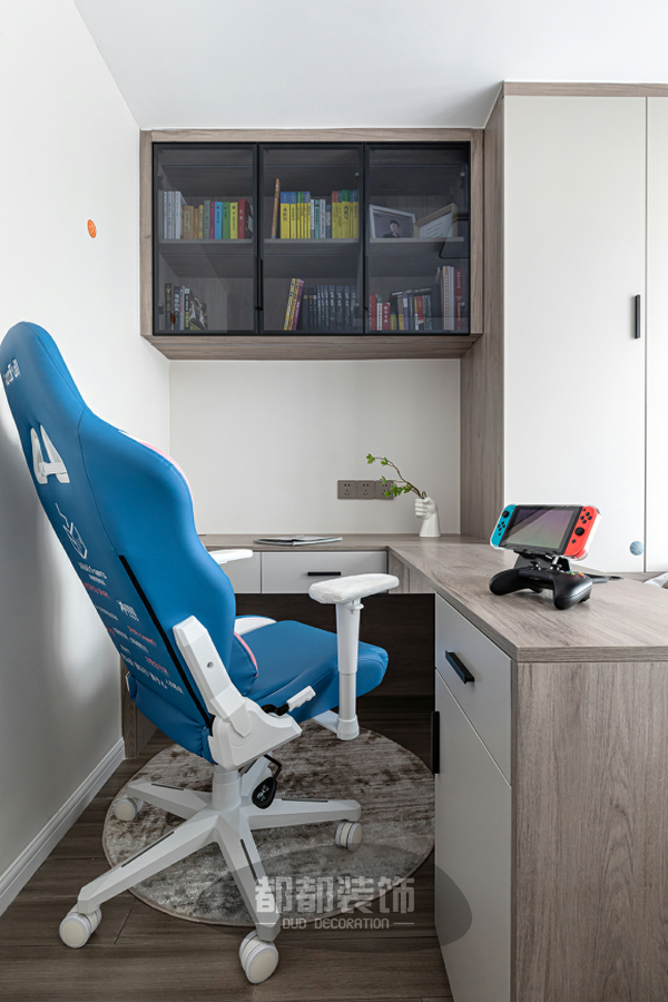 转角+隔断的巧妙设计,完美的实现了功能分区,书柜呈上下结构,巧妙地利用墙面空间,用储物柜点缀墙面之余,还增加了收纳,简直一举两得!