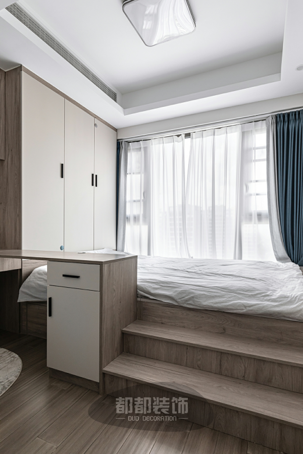 儿童房设计成了榻榻米+书房的形式,集多种功能于一身,整体空间由白色和木色铺陈,不加多余的装饰,轻柔的阳光倾洒进来,整个空间蒙上一层生活滤镜,营造出软绵温暖的格调。