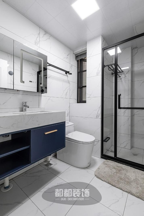 卫浴实现了干湿分离的模式,大理石瓷砖铺满三面,整体保持简单清爽的氛围。深海蓝的储物柜加以轻奢金点缀,更显时尚雅雅致感。