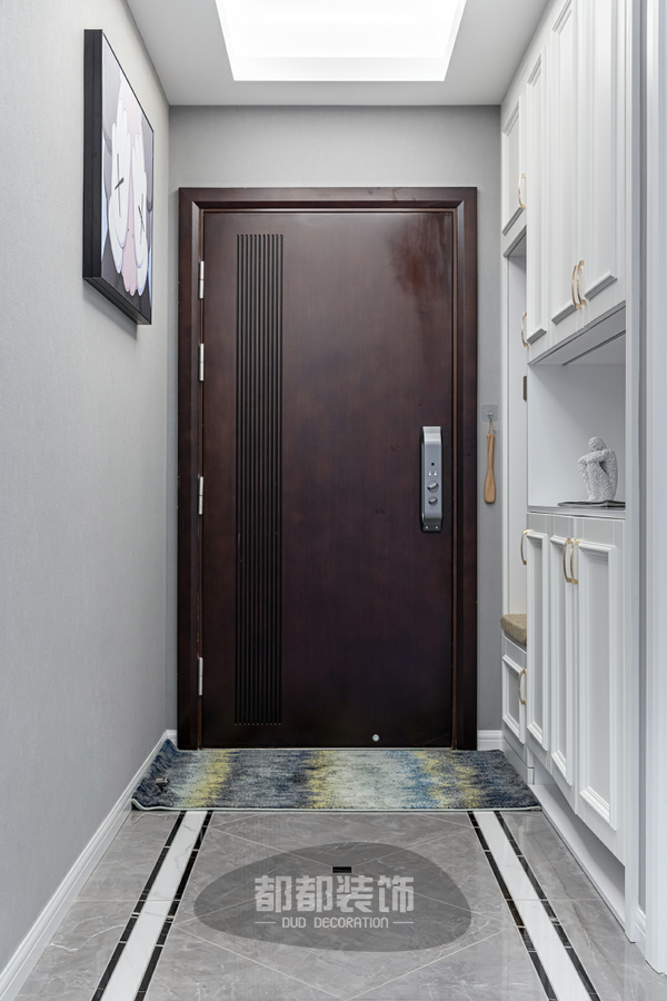 入户左侧做了一组到顶玄关柜,为了缓解柜子的厚重感,中间留空做了高低不同的隔层,方便业主出门换鞋,放置一些随手拿取的钥匙小物,精致有趣的小摆件等。