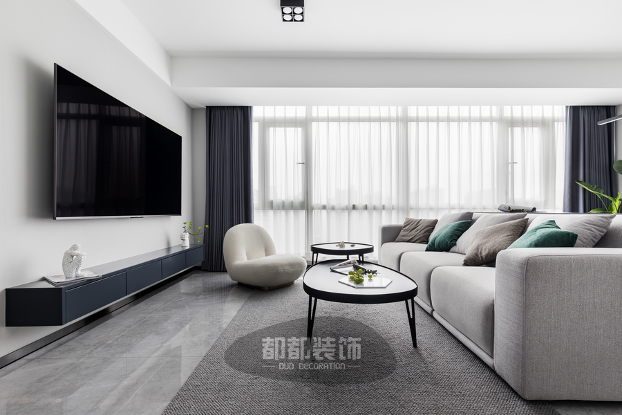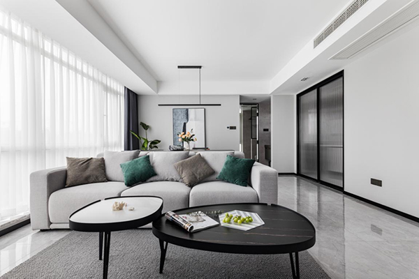 步入客厅之中,如水般和谐流淌的黑白灰之调,成为了整个空间的主旋律,设计师选用的柔和淡漠裸色来装饰家居,雾霾蓝理智克制,雅致灰柔和冷淡,不张扬不夺目,却更能给人一种视觉上的舒适感,加以对比鲜明的复古墨绿色,更显出空间的高雅格调。#你家客厅是怎么配色的?