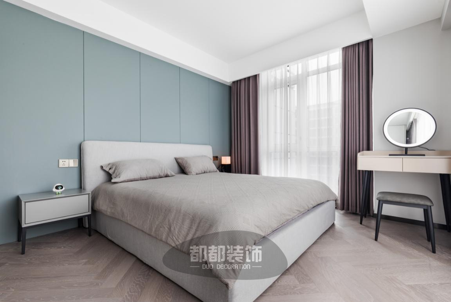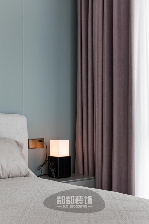 卧室没有过多的装饰,前卫时尚的床头灯营造出慵懒优雅的气氛,当高雅的雾霾蓝遇上莫兰迪紫,自然是浪漫到骨子里。