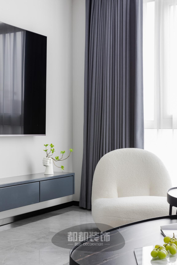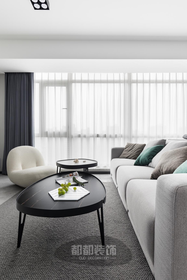 设计师将原本的通长大飘窗打通,扩大了客厅的面积,大面积的落地窗将自然光线引入室内,让光线效果达到最佳状态。大理石地板是点睛之笔,巧妙的打破了低饱和度色彩的寂静氛围,融入了自然之美,让客厅更有一派轻奢之感。#晒晒我的新家