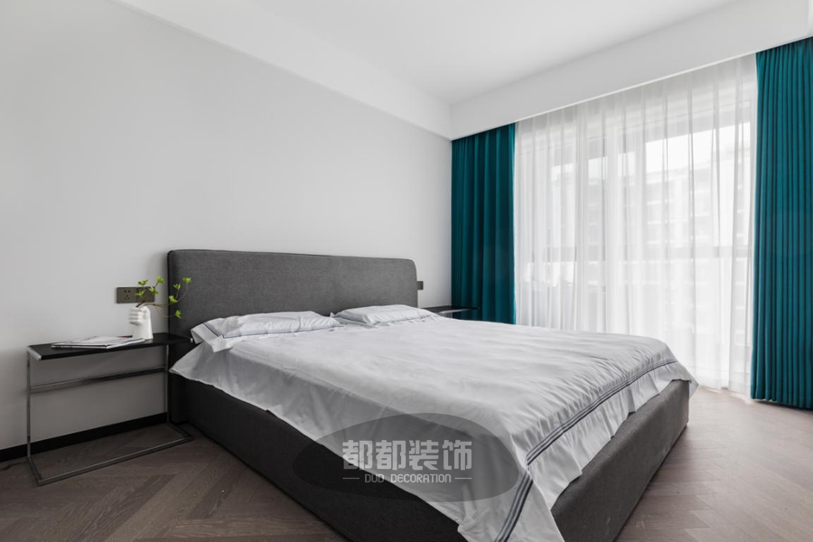 次卧颜色简单干净舒服,延续主卧的风格,大面积白色系为主,搭配对比度鲜明的复古墨绿窗帘,富有层次感。