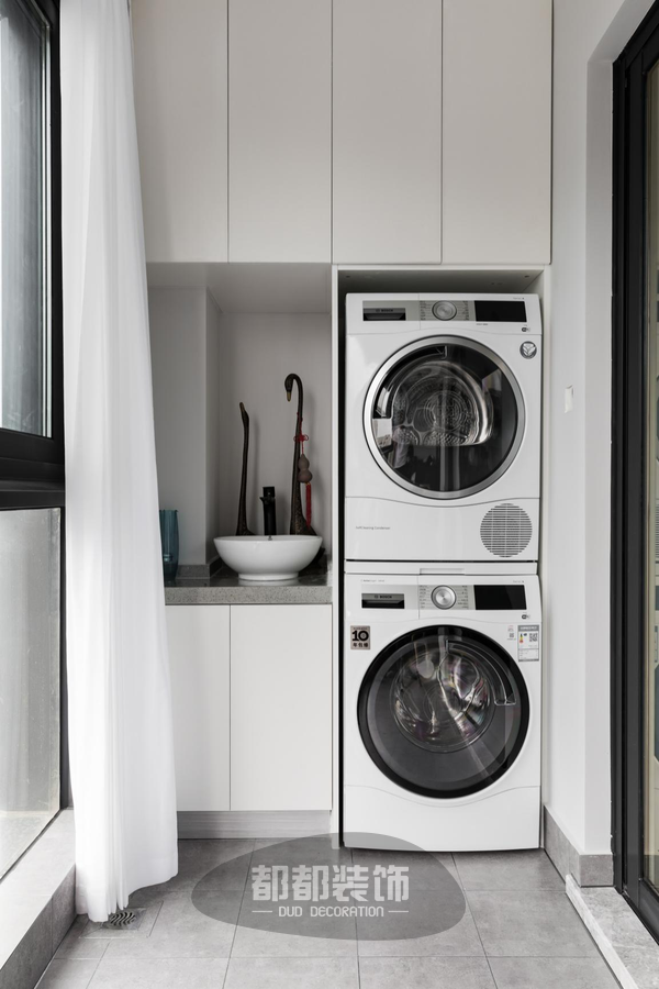 顶天立地的白色储物柜使用能装,承包了阳台区域的收纳需求,底部预留空间,嵌进了洗衣机和烘干机,洗晒功能全部得到实现,赋予了生活更多便利。