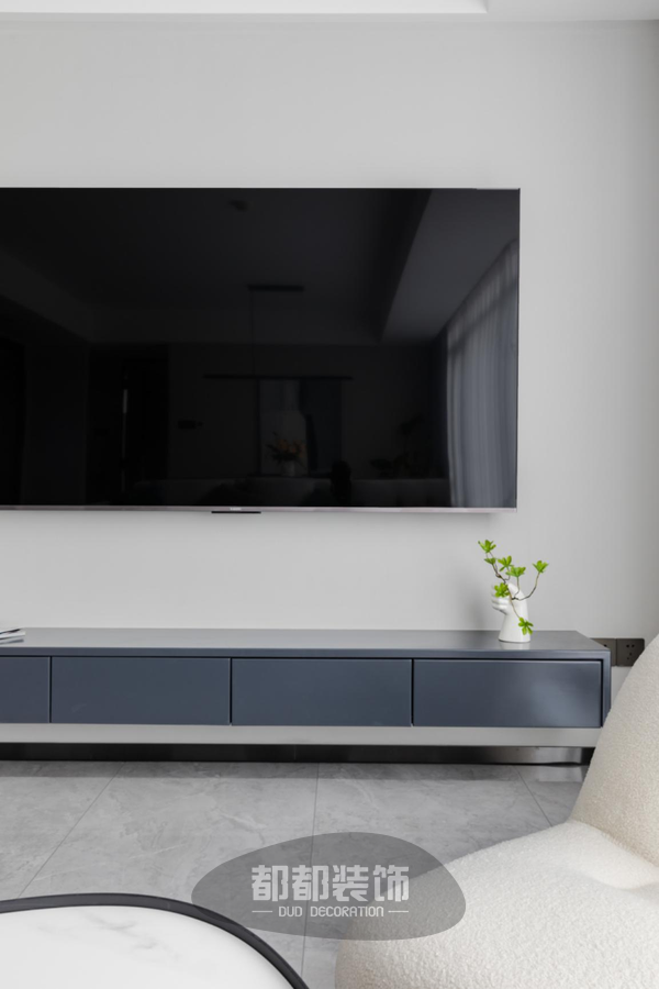 老人喜欢素净,电视墙并没有过多繁杂花哨的设计,删繁就简,简单的大白墙给人在视觉上杂乱无尘的感觉,悬空嵌入墙中的储物柜,随意点缀的绿植,为单调的空间,注入了一丝烟火气。