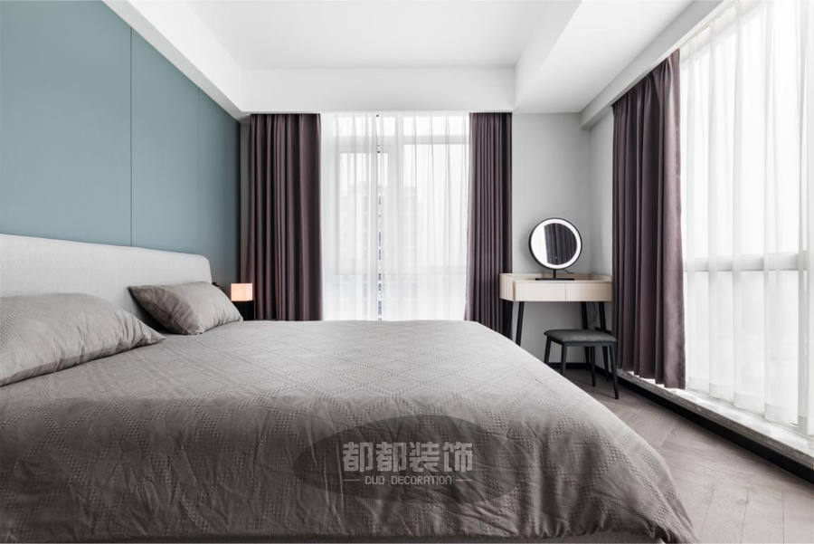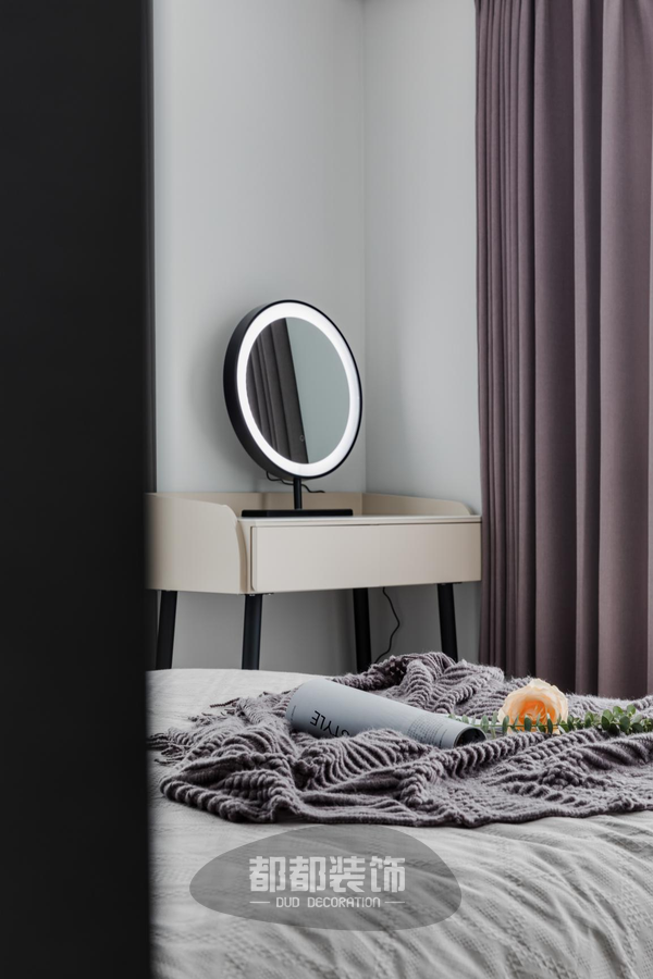 雾霾蓝的墙面拥有一种高冷而梦幻的气质,再加入更富有浪漫情调和优雅的紫色窗帘,哑光质感的墙面,弱化了紫色的艳丽,如同床边的薰衣草,能够安抚人身心的疲惫。
