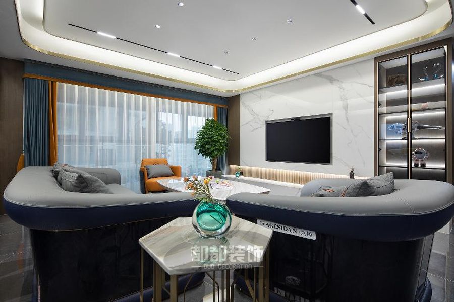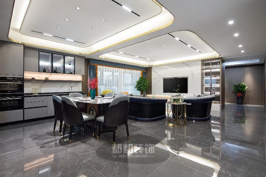 大理石、皮饰、以及木饰面,搭配黄铜、丝绒等材质,细节处点缀闪亮元素,经过巧妙的混搭与组合,打造出客厅的一派简约轻奢的气度。