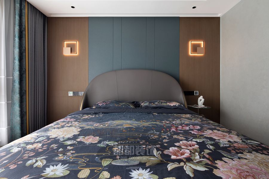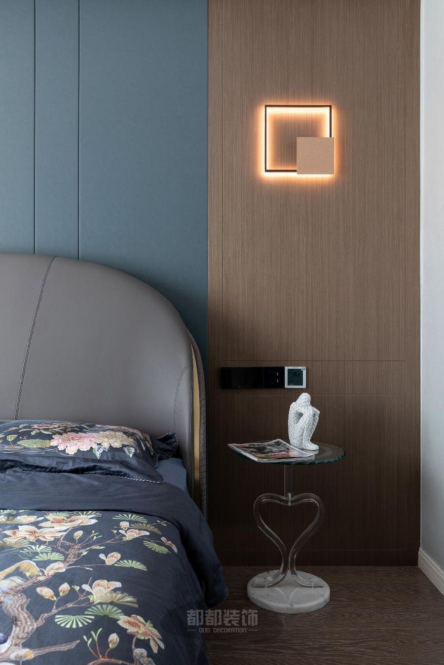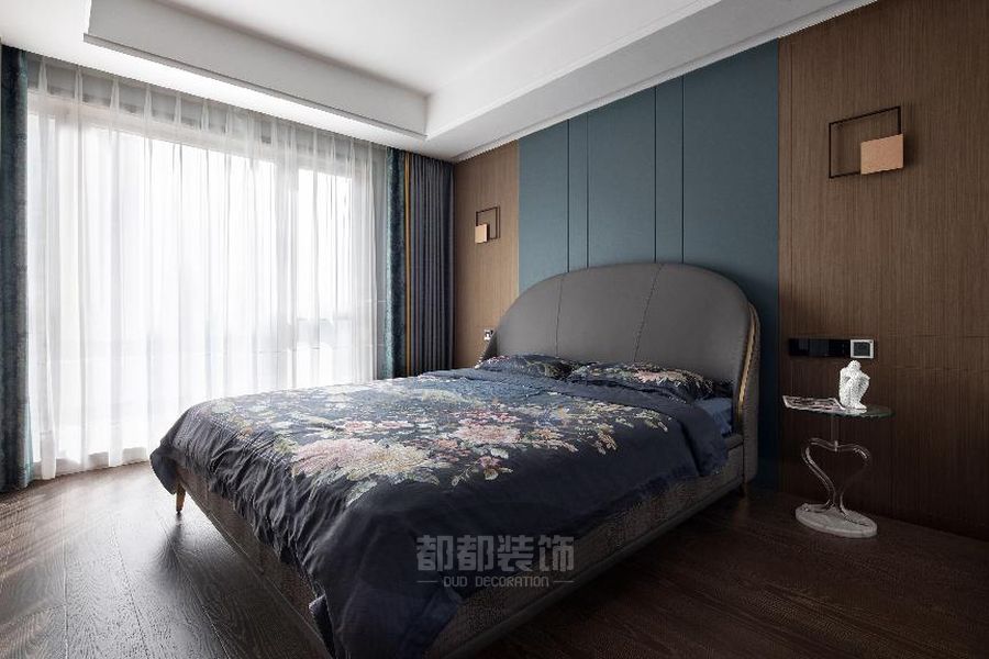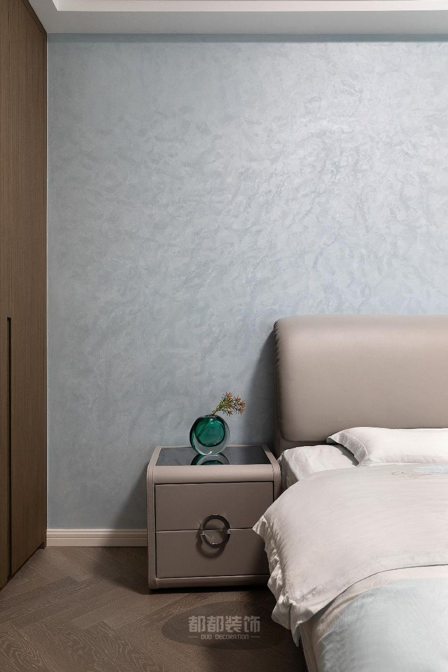 主卧以灰蓝色为主色调,加以自然沉稳的木饰面,稳重有质感,宁静不冷漠,自带奢华感和高级感。