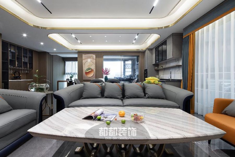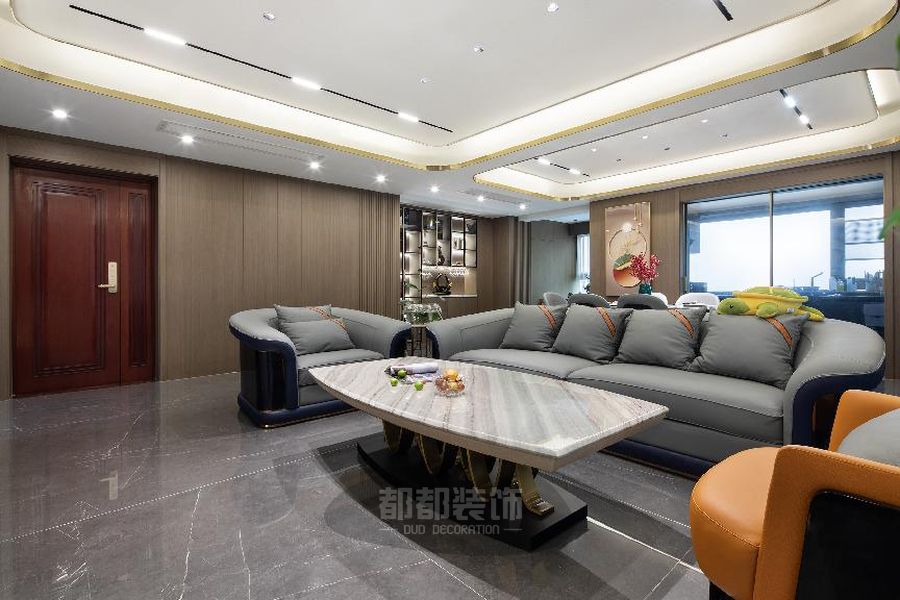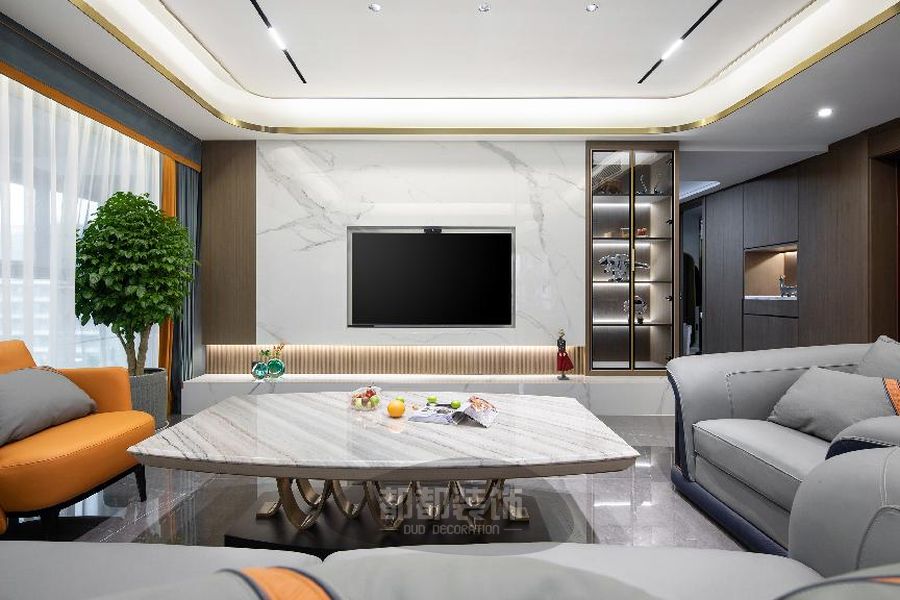 用开放式的手法去诠释整个空间,入目是不同层次的黑白灰流淌,点缀以跳色棕橘,使时髦现代的优雅感流淌于客厅间。