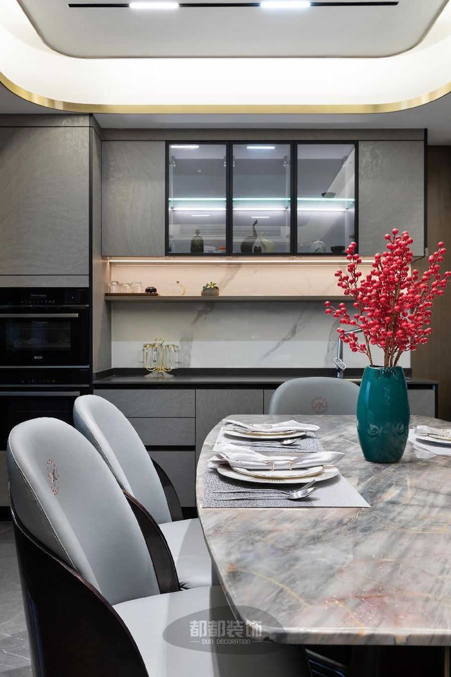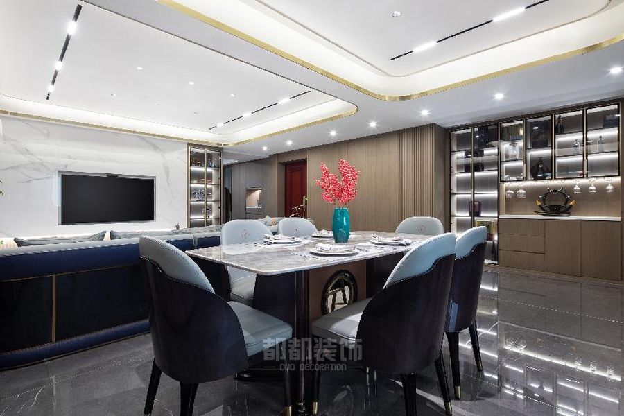 餐厅延续了客厅的一致风格,既没有过于繁复的造型,亦没有丰富色彩的叠加,餐边柜与酒柜的使用,给人带来轻松舒适感的同时,加了几分大气与时髦度。