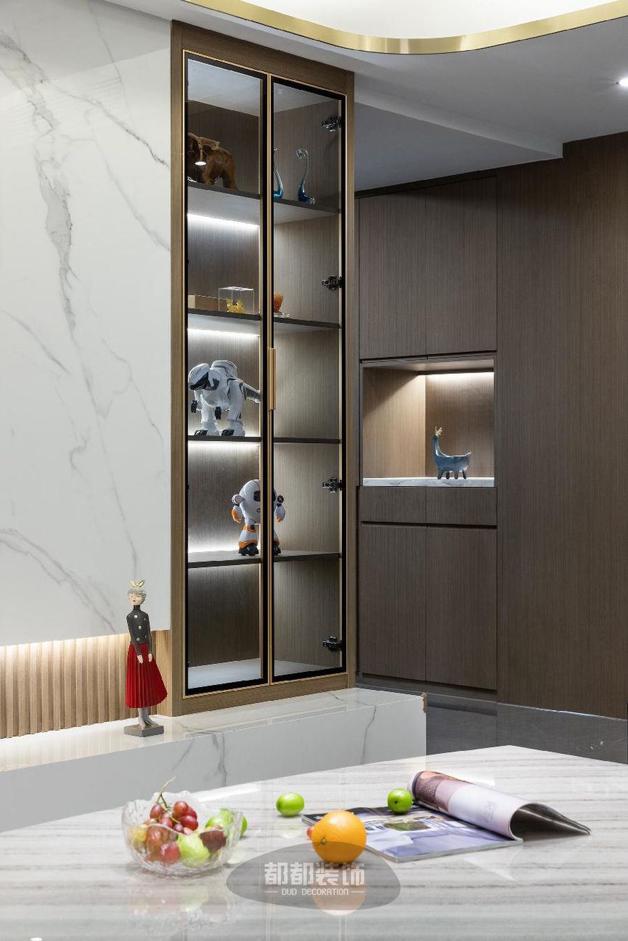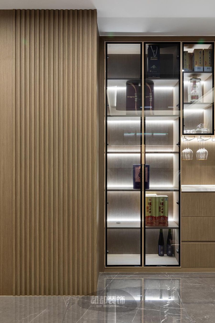 温润自然的木质面带着天然的亲和感,恰到好处的中和了空间内的冷峻,酒柜无把手设计,搭配玻璃门,通透明亮,在简单中营造出奢华感。