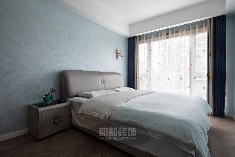 次卧延续了主卧蓝色的风格,清新温柔,花纹若隐若现,地板是人字铺,衬的整体空间时尚且有质感。