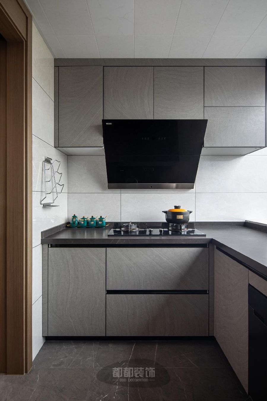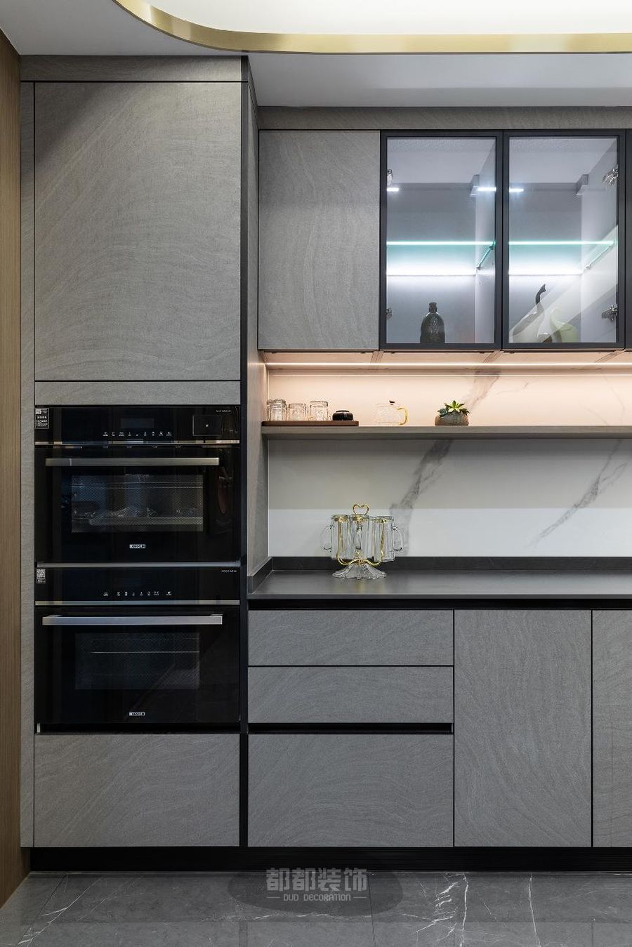 厨房采用高效的L型布局,整体衔接流畅,空间内黑白色系搭配,强烈对比加深了视觉冲击力,橱柜顶天立地,采用了无把手设计,视觉极简清爽,整体质感极佳。