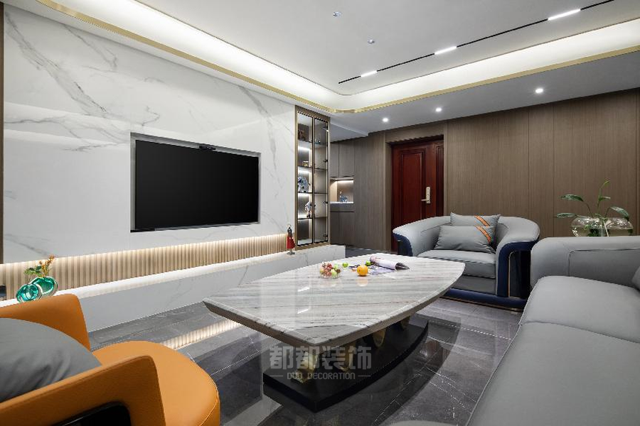 大理石电视墙花纹如烟波浩渺,简约不简单,右侧内嵌置物,业主喜欢的摆件手办在灯带下熠熠生辉,可谓是藏秀并举。