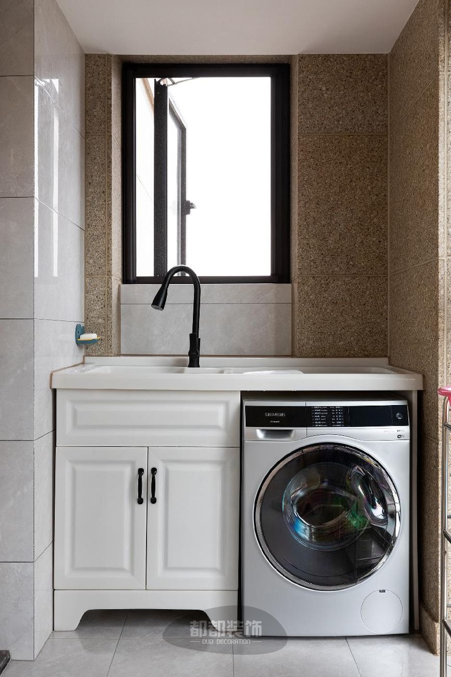 阳台光线充足,承包了洗晒功能,定制白色洗衣柜嵌入洗晒一体机,做了台下盆设置,卫生无死角,空间虽小功能齐全。