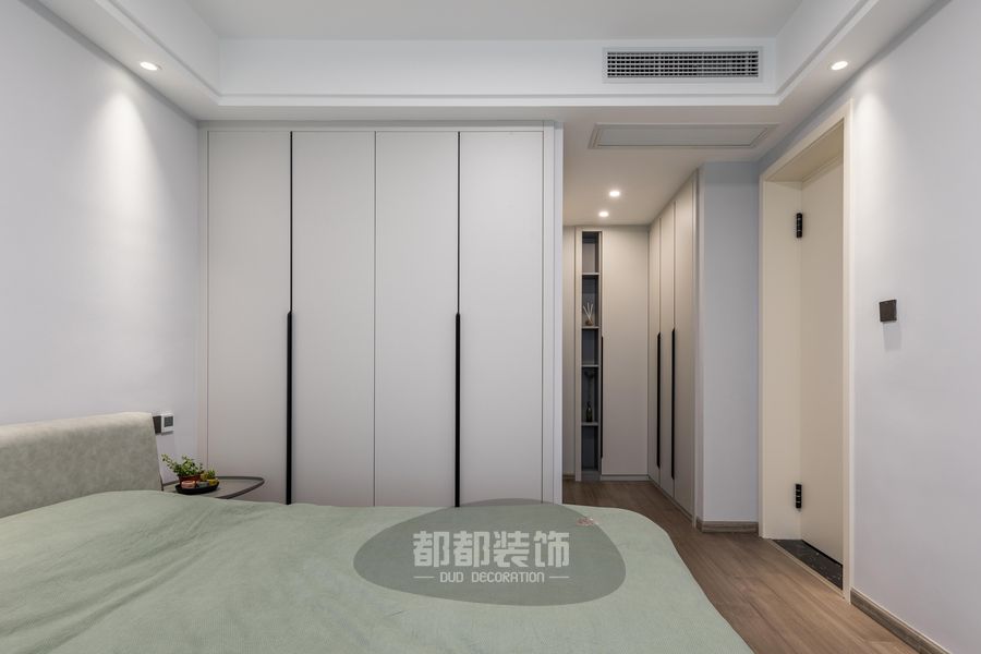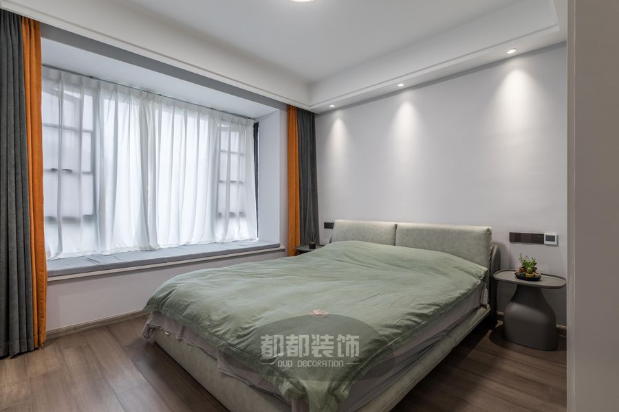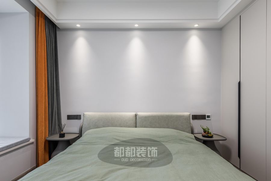 主卧空间风格设计上还是遵循以简胜繁,用白色作为主色调,奠定了温馨柔和的睡眠氛围基调,淡绿色布艺床和意境十足的飘窗的加入,为空间带来宁静内敛的高级质感。