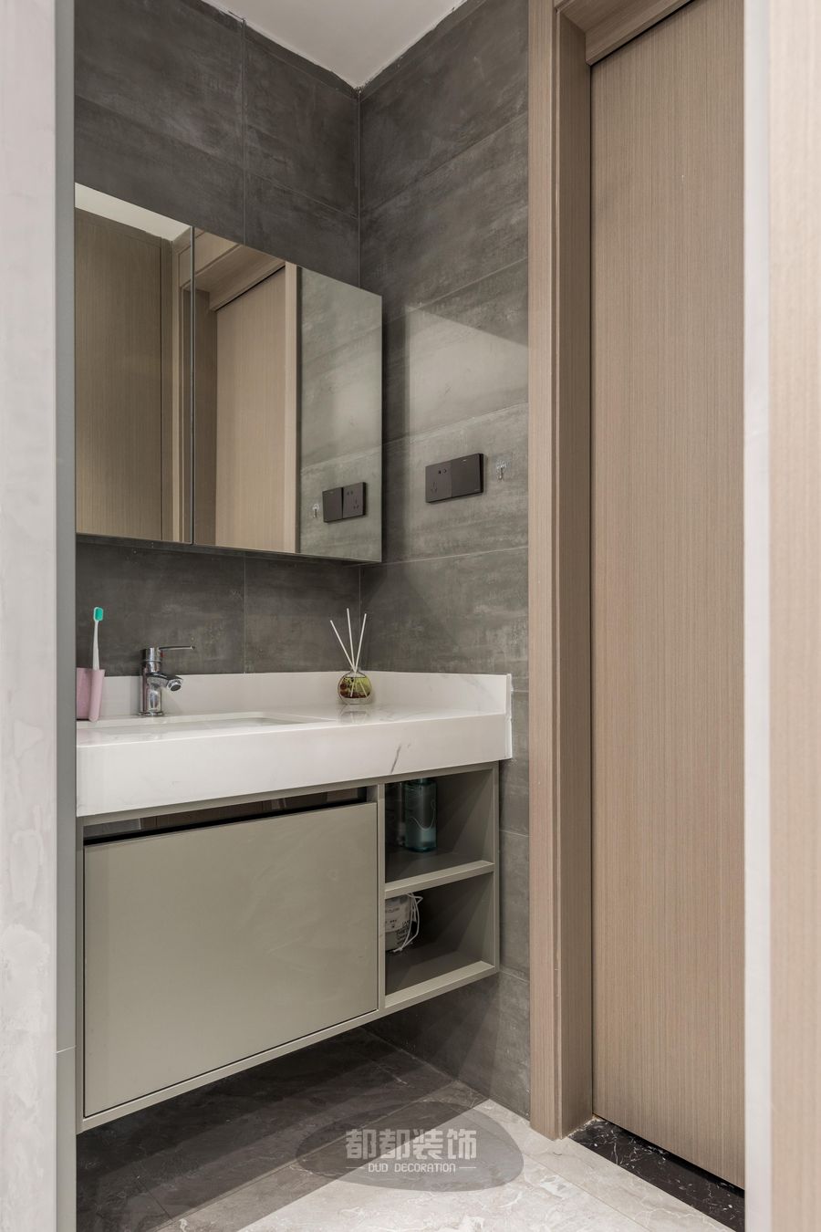 卫生间延续了客餐厅公共空间的简洁基调,色系百搭,区域合理划分,在紧凑的空间内实现了实用性最大化,柜体处加入原木元素,为空间注入些许醇厚温暖感。