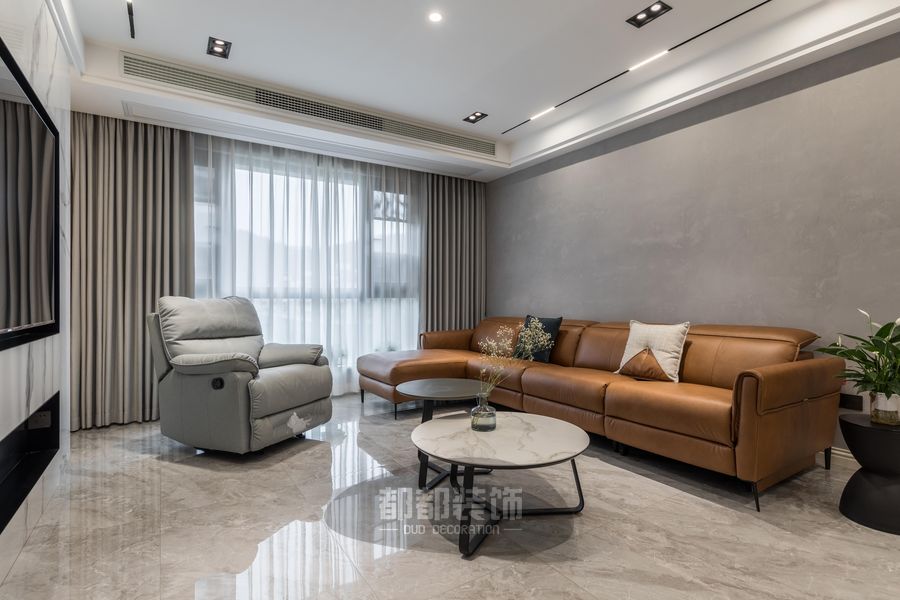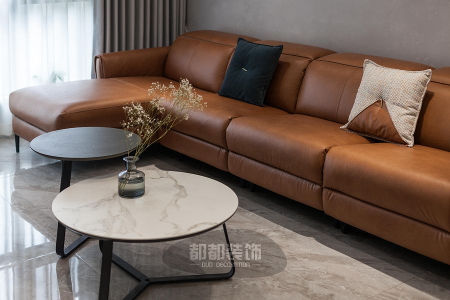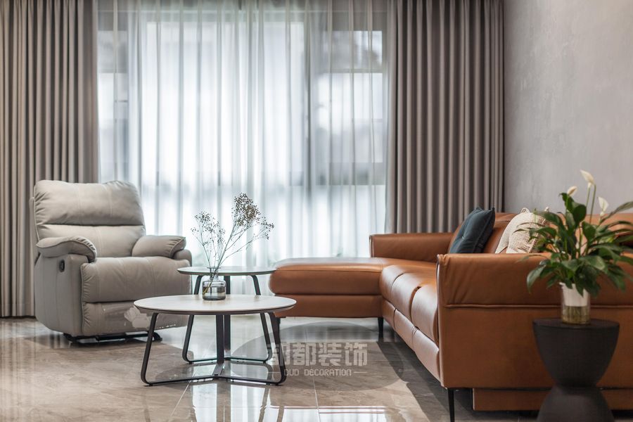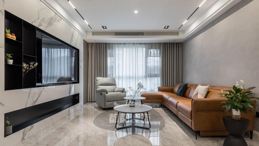 客厅整体的灰色主调,分分钟把空间质感拉满。L型布局的“高级灰+橙色”组合沙发,可坐可躺,搭配简约的小茶几,可以满足多种生活场景。元气绿植点缀空间,邀阳光入室,揽清风入怀,开启美好惬意时光。