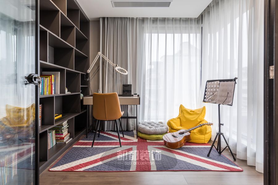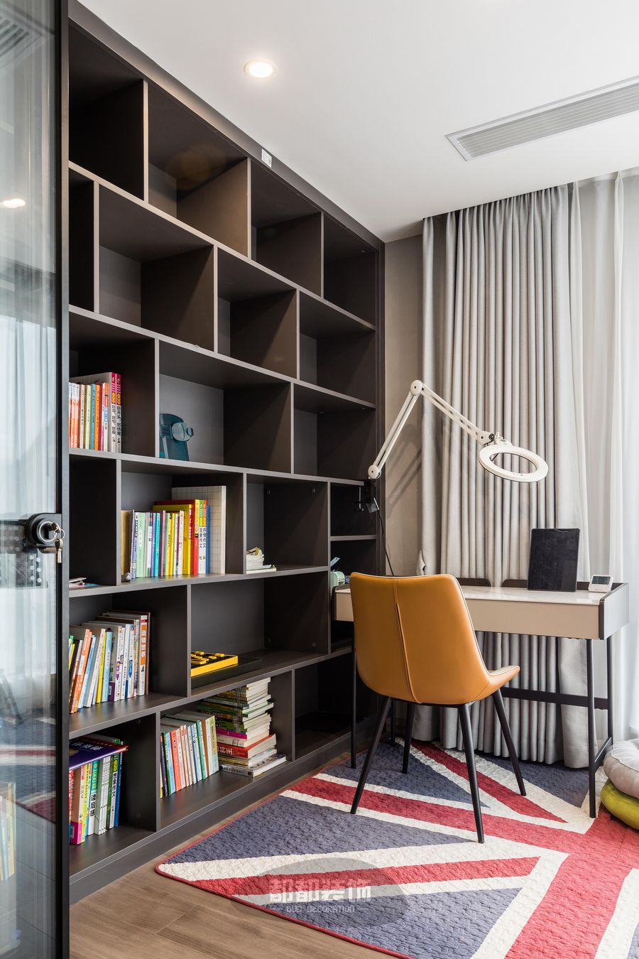 一整面多层隔板书架,搭配浅色的实木地板装饰,使得室内非常时尚有质感。简约的书桌,搭配一把舒适的椅子,日常办公显得非常有格调。大面积的白色窗帘温暖了整个书房,给人带来一种优雅从容的感受。