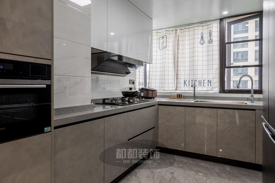 厨房设计成了U型布局,完美解决了厨房的两个转角,让转角也实现了空间利用,上下双层柜体设置,增大了厨房的收纳功能,同时留出冰箱位置,整体达到和谐度与实用度兼具的效果。