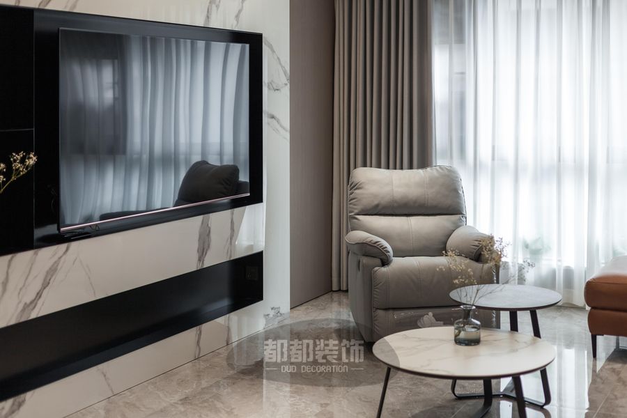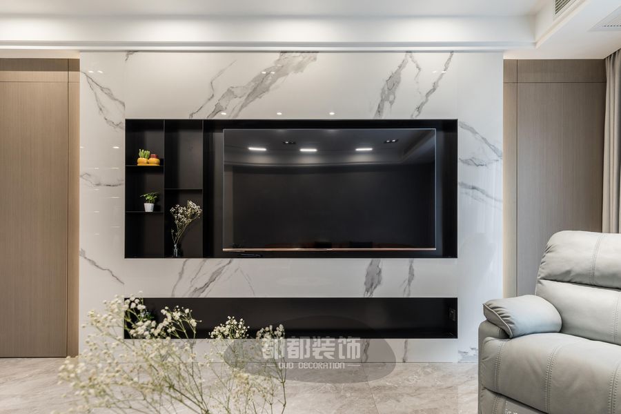 电视背景墙采用整面岩板墙,摈弃了多余的累赘性装饰后,内嵌大屏电视,凝练的大理石纹理有效延伸了空间的整体视觉感,背景墙在灯光的映衬下,塑造出简洁、大气、温馨的墙面风格。