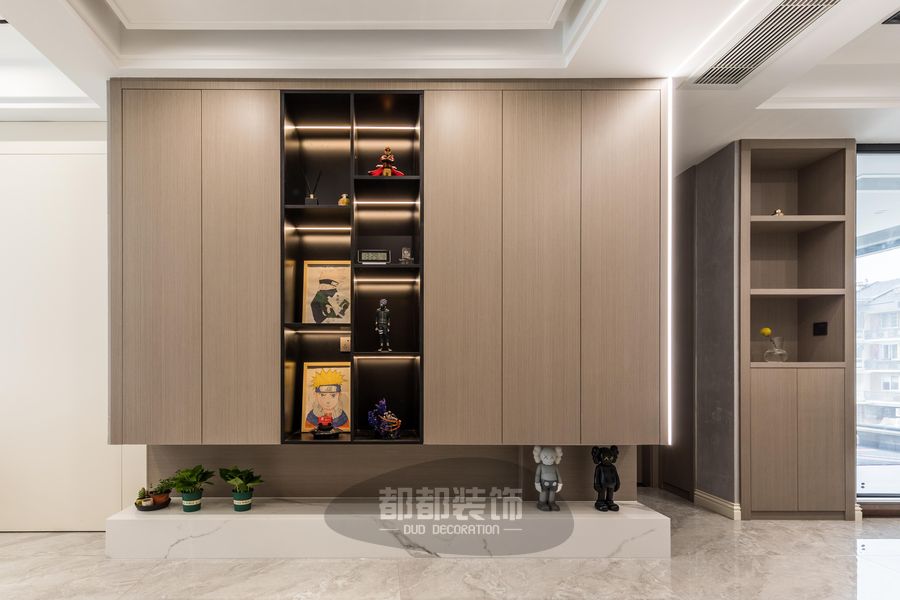 入户即是格调十足的玄关,设计师特意在储物柜中间留出了长方形开放格,搭配一组抽象装饰画,点缀些许艺术摆件、绿植,自成一景的入户端景,避免了一进家门就是一面柜子的压抑感。
