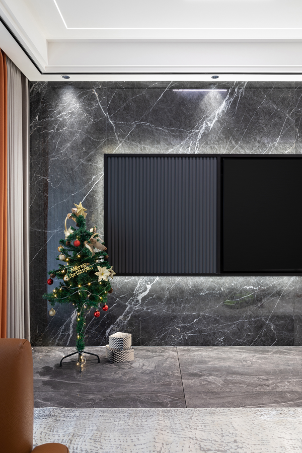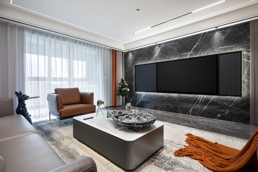 电视背景墙使用大面积拥有自然纹路的大理石,中间黑色木饰面与电视融为一体,细看却处处都是趣味性的细节设计,整体的实木墙面与一旁的隐形门区域巧妙融为一体,客厅整体感更强,无需过多刻意的造型修饰,也能使空间变得沉稳而又时尚。