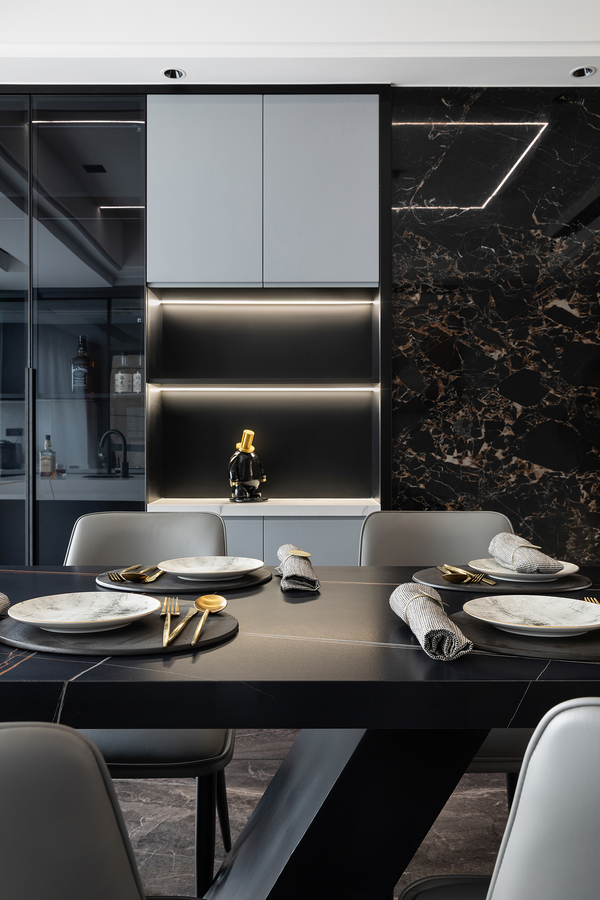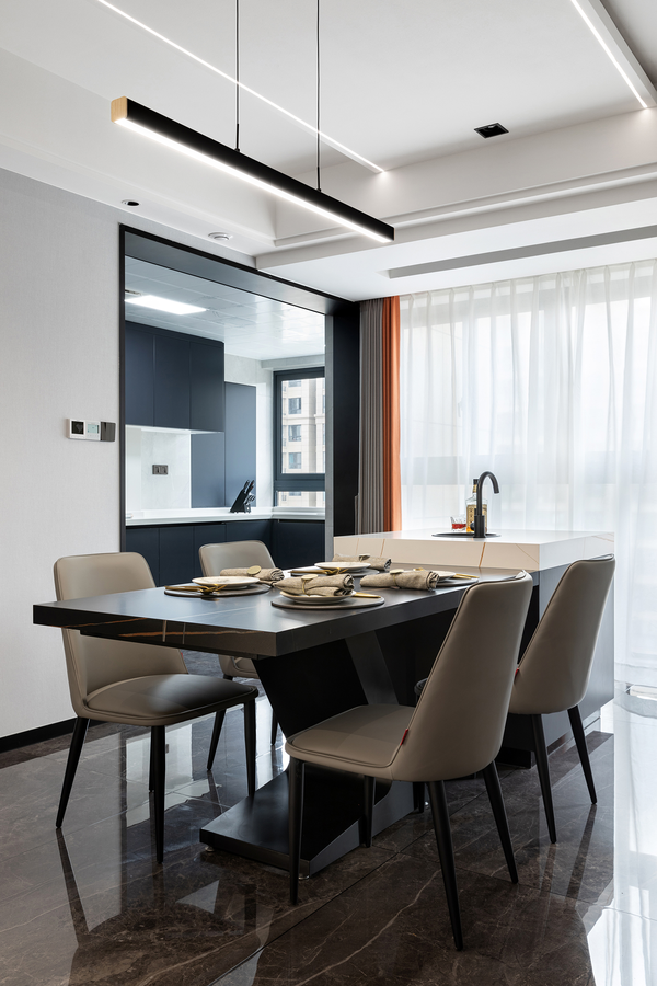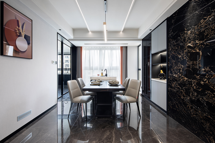 客餐厅一体化,现代化线条式设计感吊灯使得餐厅低调现代,一整块黑金大理石装饰,色泽鲜明,典雅奢华,两者交相融合,别具特色,令人惊艳。
