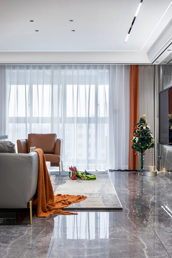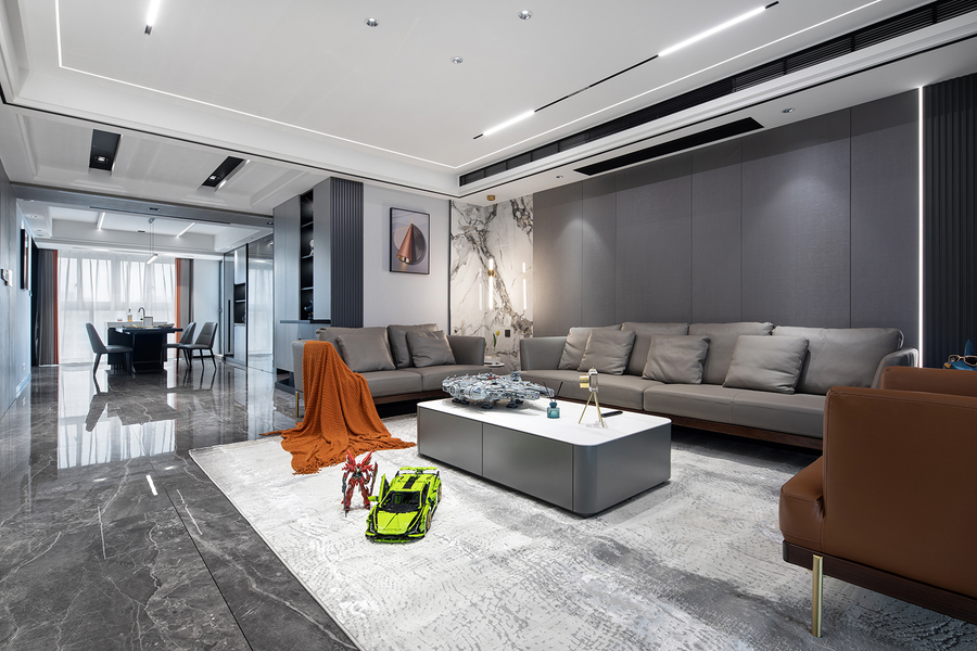 步入室内,客餐厅呈开放式,南北通透,整体和谐的黑白灰为基调,统一中又富有变化,顶部无主灯设计,黑色线条贯通南北,简约大气,细节处点缀红、橙、黄等热烈的色调,与中性冷调融合后呈现出来的时髦、放松、恬静的氛围,内敛中透露出低调的质感。