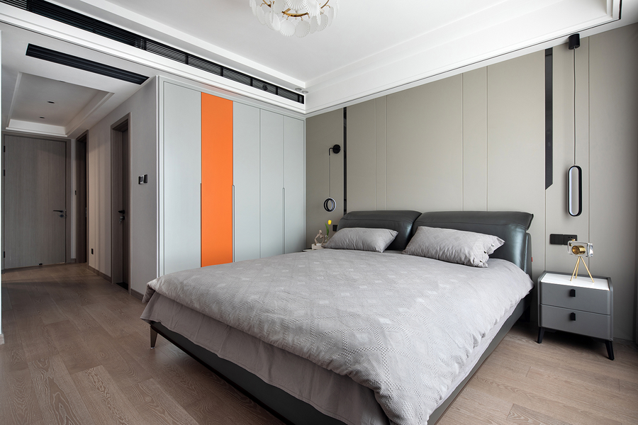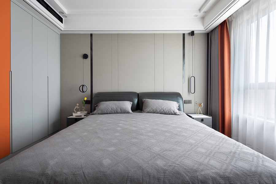 卧室以温馨的灰色调为主,硬装做了简洁处理,质朴、宁静的氛围与平和的皮质、舒适的布艺塑造出柔和的意境,两侧垂吊而下的不规则吊灯,造型别致,温馨的灯光创造出卧室浪漫的气氛。