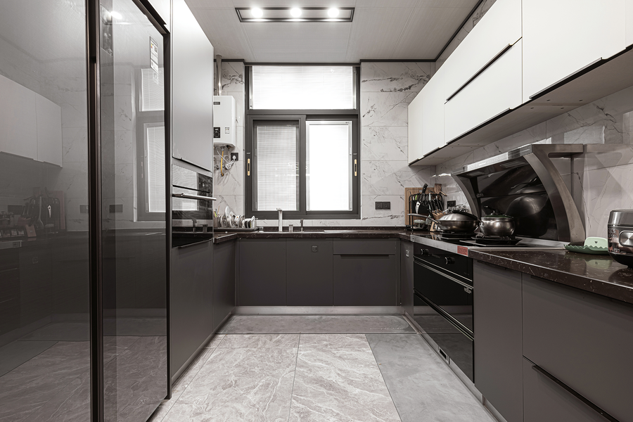 U型厨房同样延续黑白灰风格,上下橱柜大大增加储物空间,水槽、洗碗机、蒸烤箱等一应俱全,方便日常烹饪备餐。