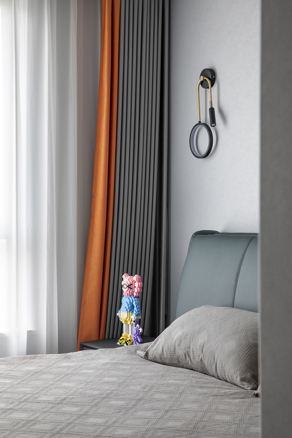 次卧整体色调为灰蓝色,大衣柜嵌入墙体,到顶的设计收纳空间充足,实木地板温馨自然,橘灰色窗帘为空间透出一丝活泼时髦。