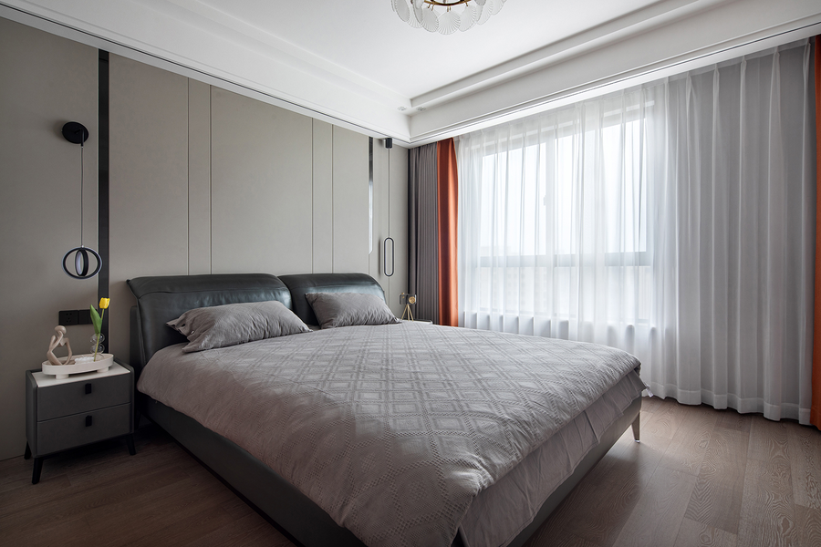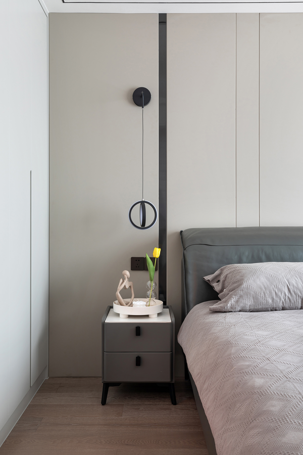 整体的床品均采用饱和度低的灰色调,简单之中透露着雅致,小巧精致的床头柜上摆放清新自然的绿植,使得简约的空间更加时尚高级。
