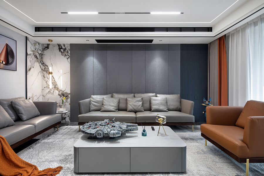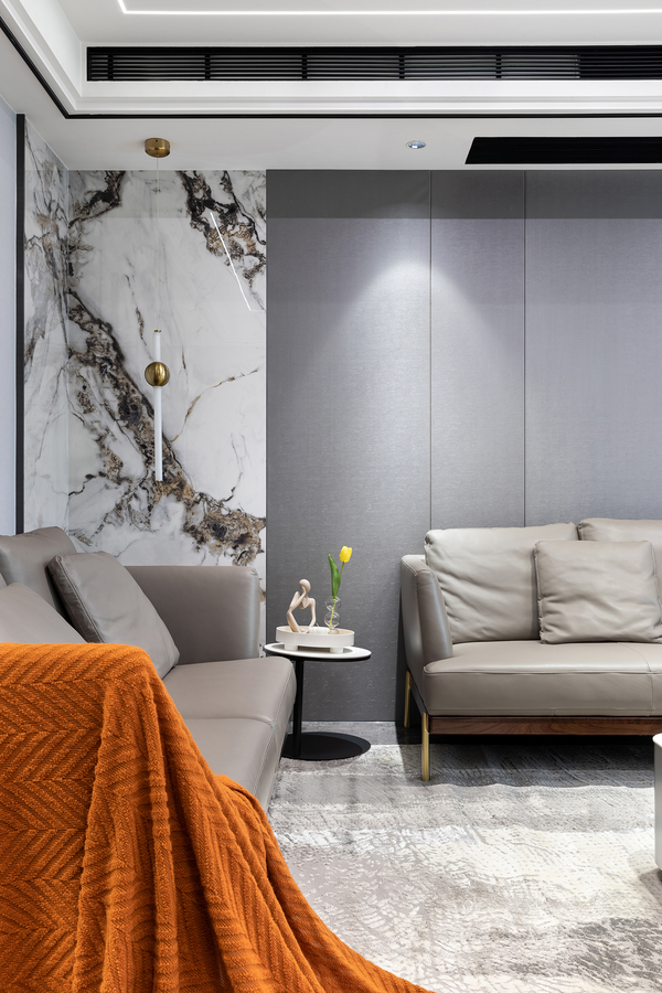 沙发背景墙简约大方,没有多余的挂画装饰,两侧以大理石和木饰面装饰,不对称的设计整体和谐又有质感,给人一种别具一格的美感;吊灯造型别致,在灯光的渲染下,慵懒舒适的感觉在油然而生。