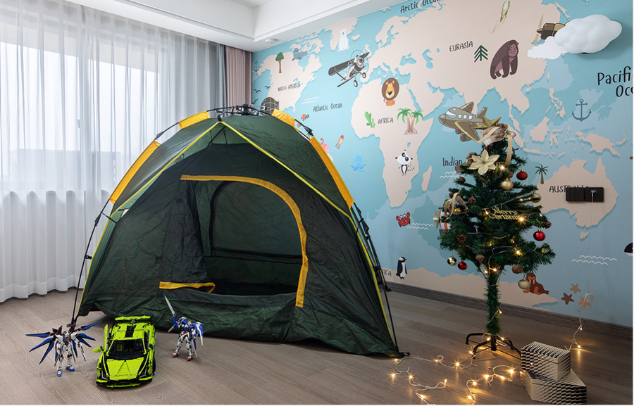 儿童房的设计别具一格,一整面的世界地图墙面童趣满满,满足了孩子的好奇心,还能让他在生活中学习到有趣的知识,除了学习空间,设计师还为小孩布置了墨绿色帐篷,为小朋友营造出一个属于自己的私密空间。