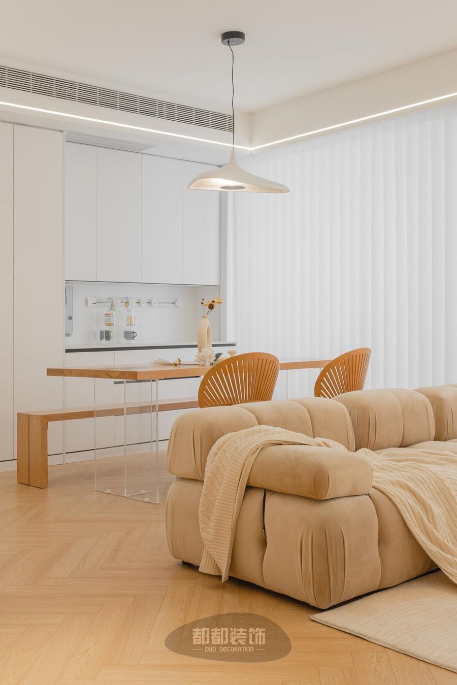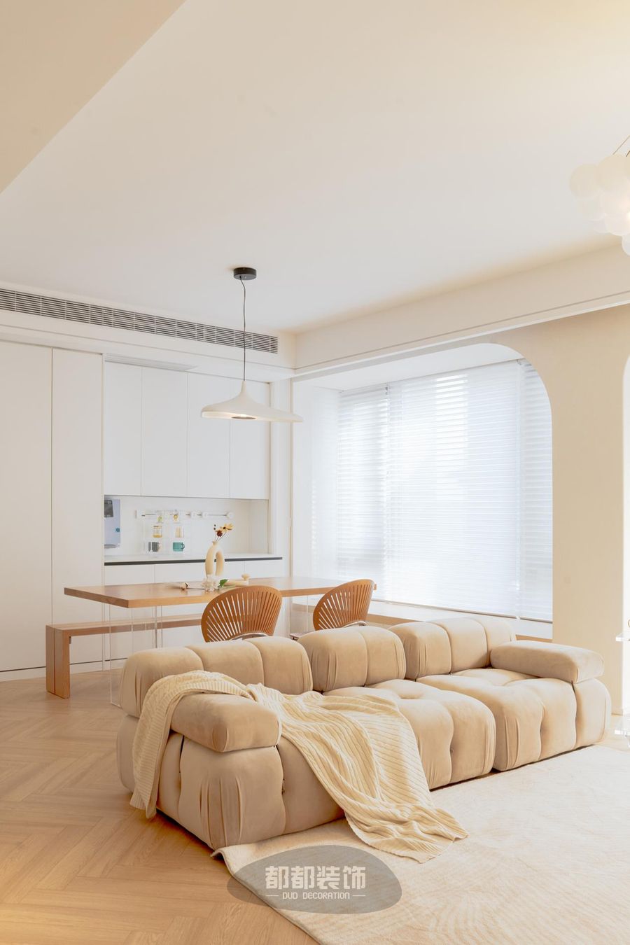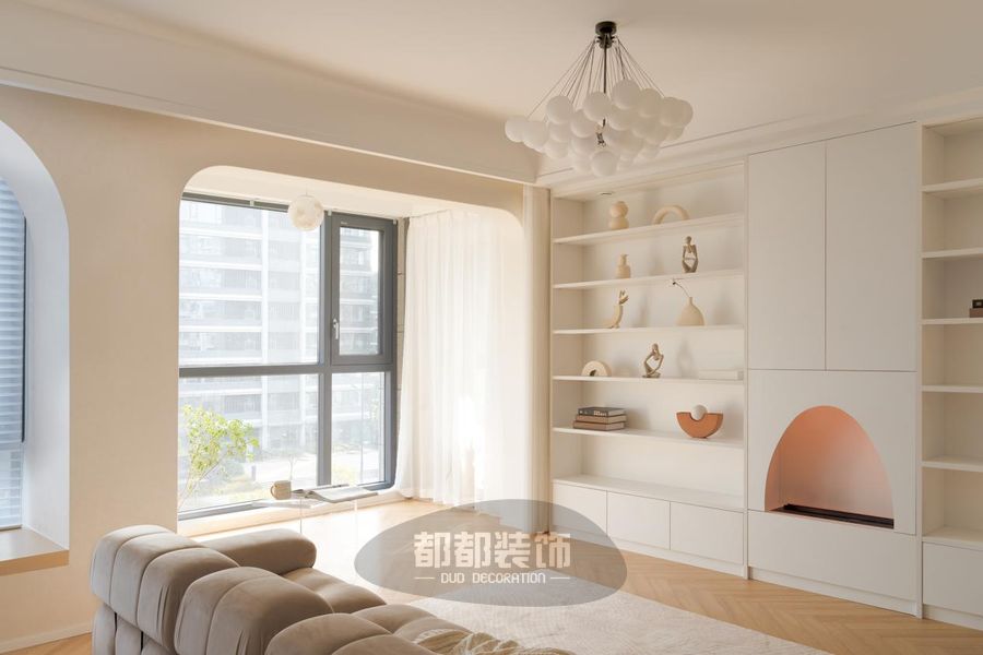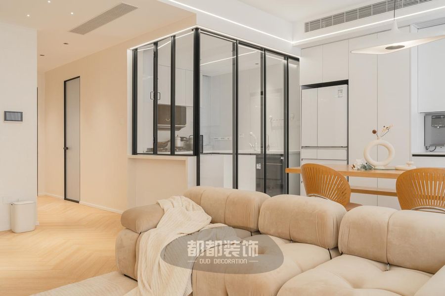 给空间加上一匙梦幻的奶油色调,调配出理想家的轮廓;鱼骨拼的木地板,因为有颜色渐变所以更显高级感,白色泡泡球磨砂玻璃吊灯加以点缀,整体设计色调温暖柔和,舒适感由然而生。