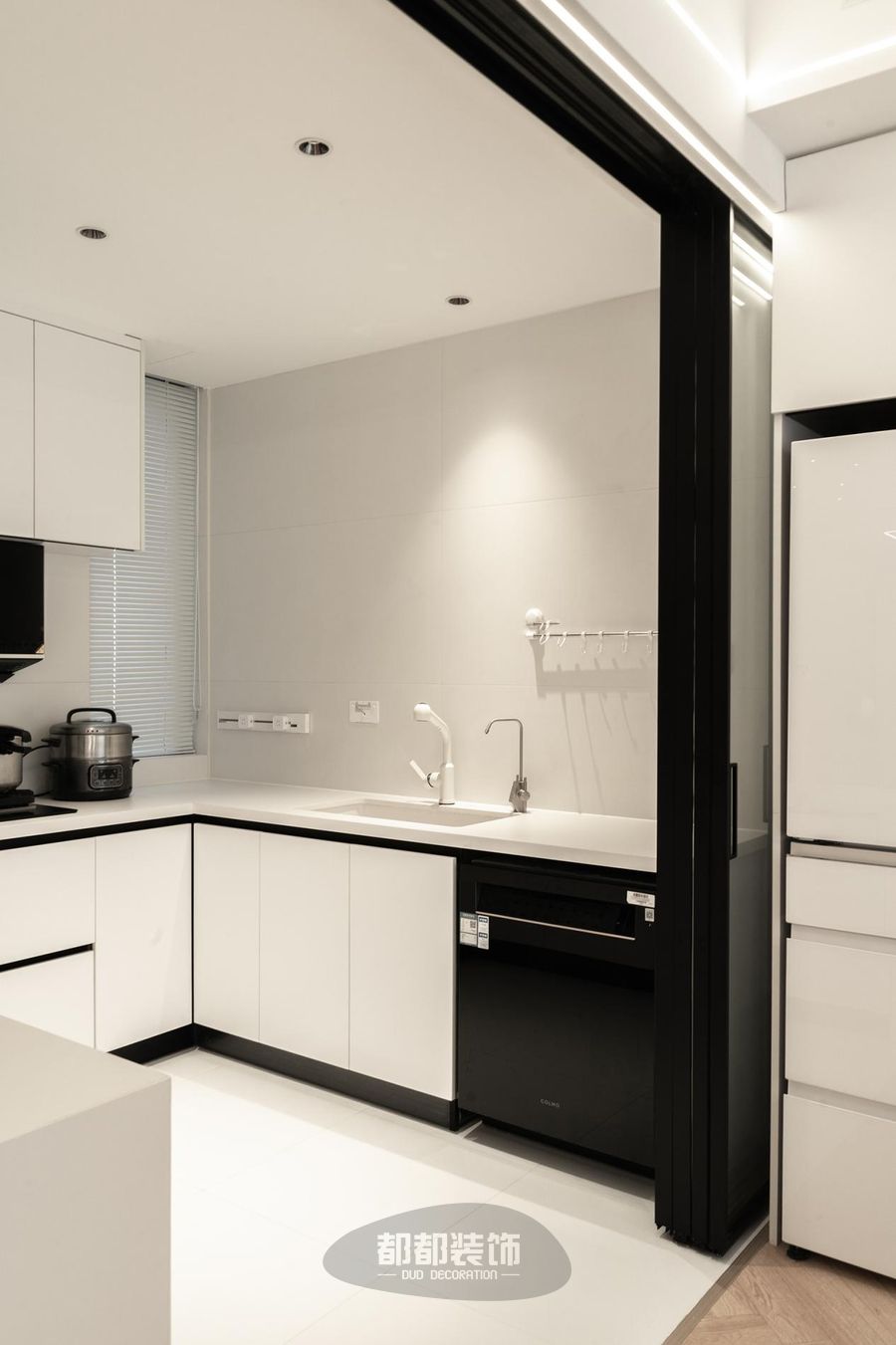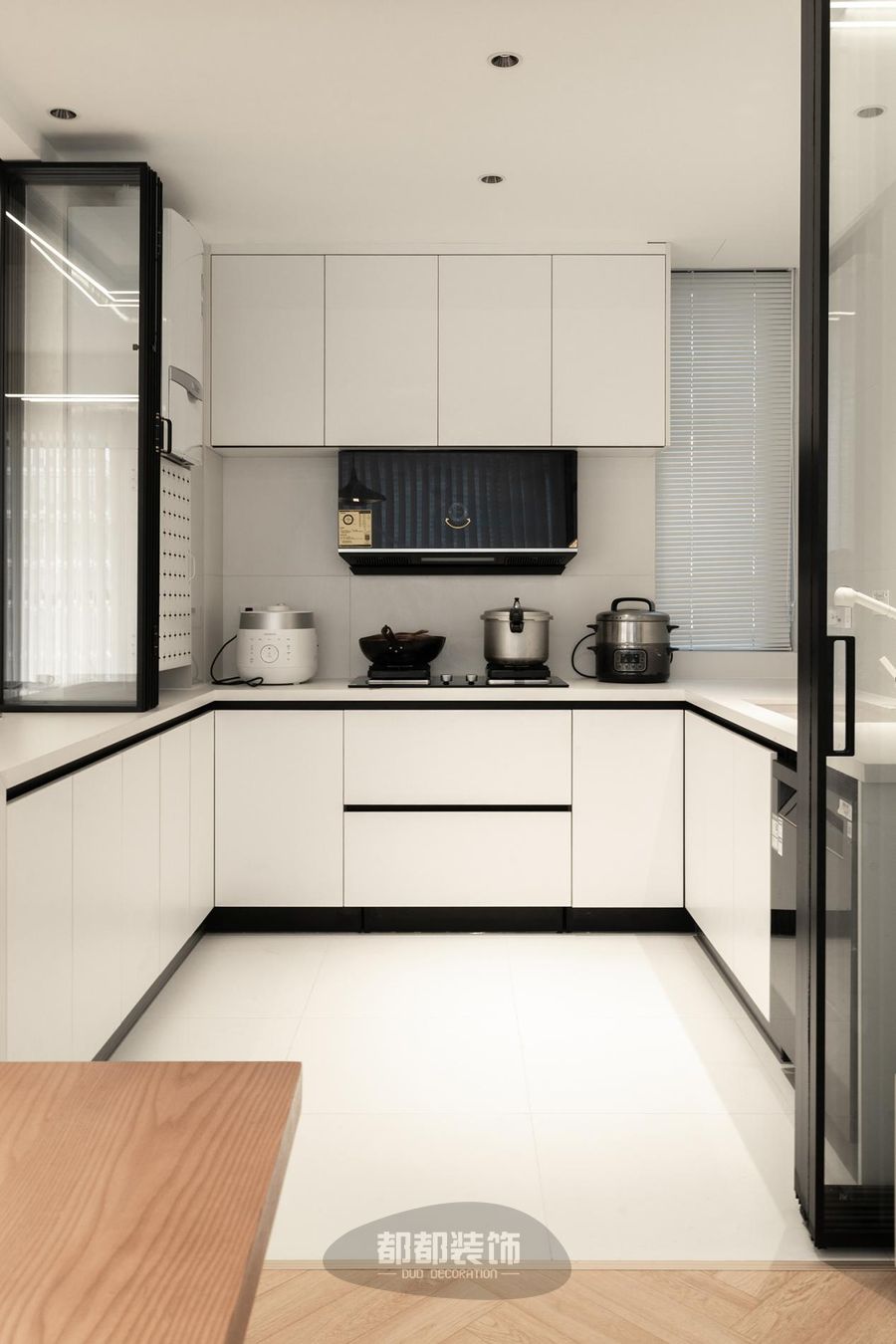 黑白调的厨房空间开阔大气,U型操作台面布局动线流畅。