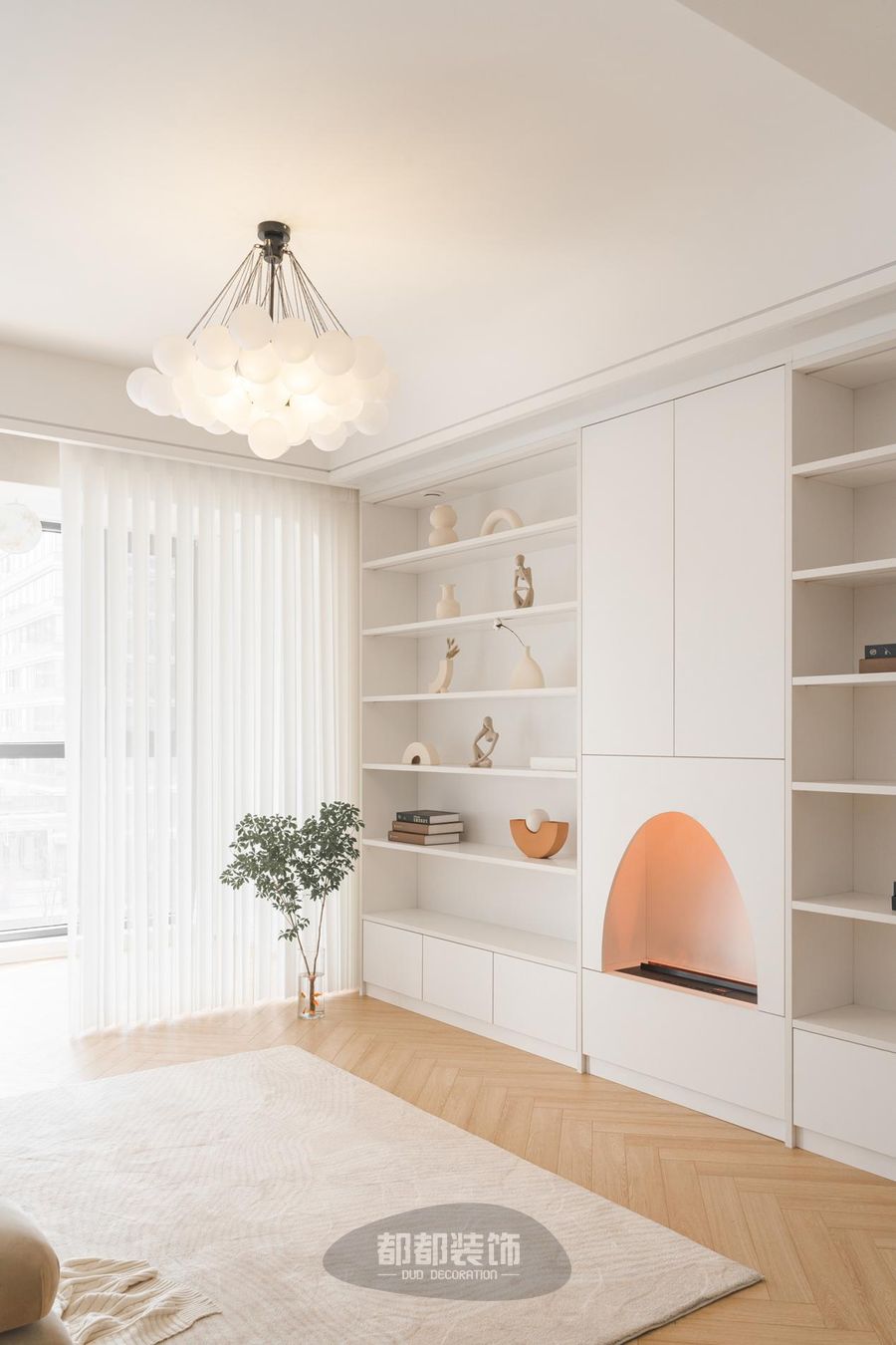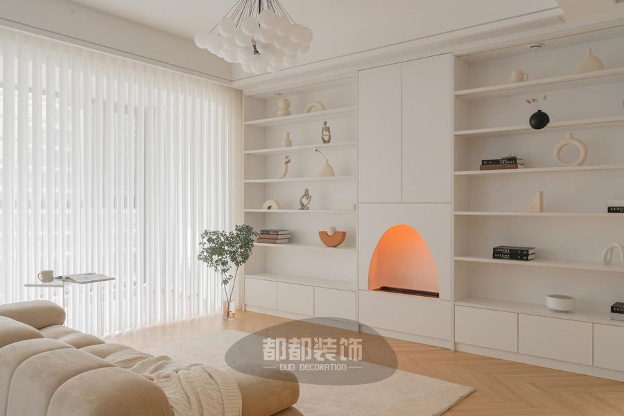 一张大地毯柔软铺陈,面包块沙发放置其中,搭配柔和的纱帘营造宁静的氛围;婆娑的光影与温软的颜色一起为空间增添浪漫的因子,瞬间每―帧都像添加了柔和的滤镜,朦胧梦幻。