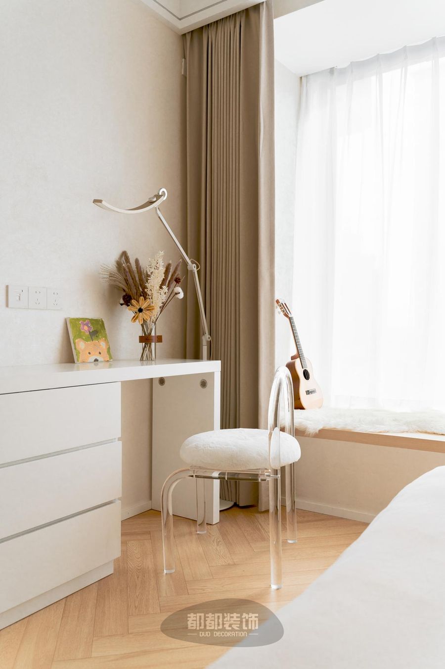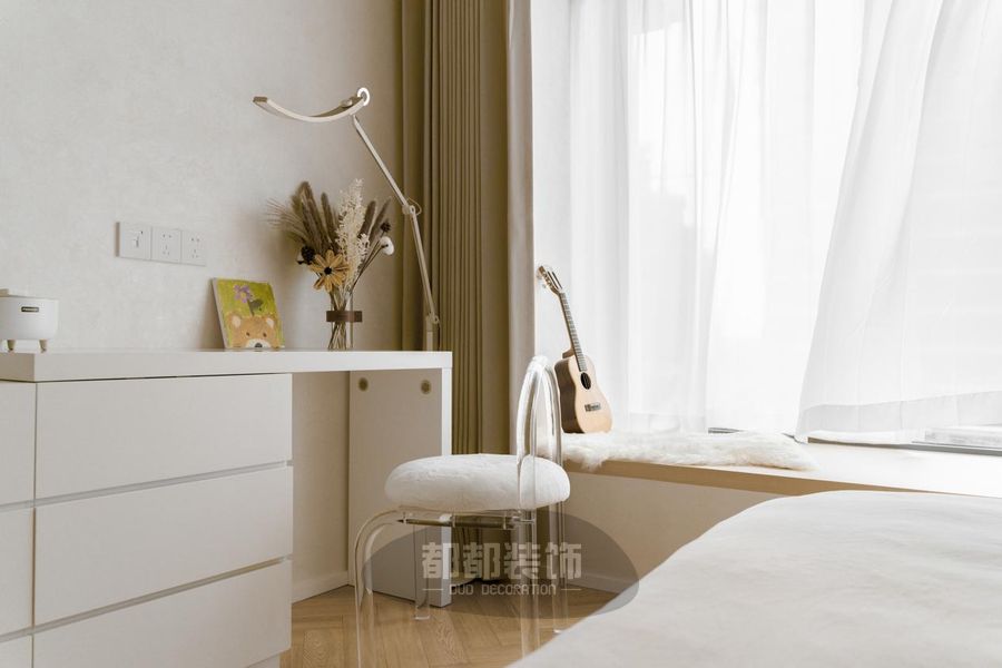 白色木质书桌搭配软包圆形椅,一柔一刚,吉他和干花加以点缀,无意间带来几分闲适之感。