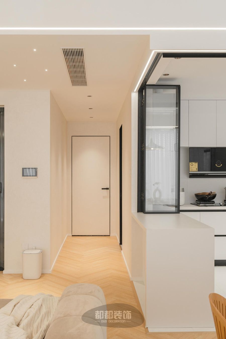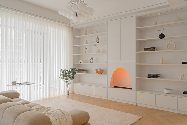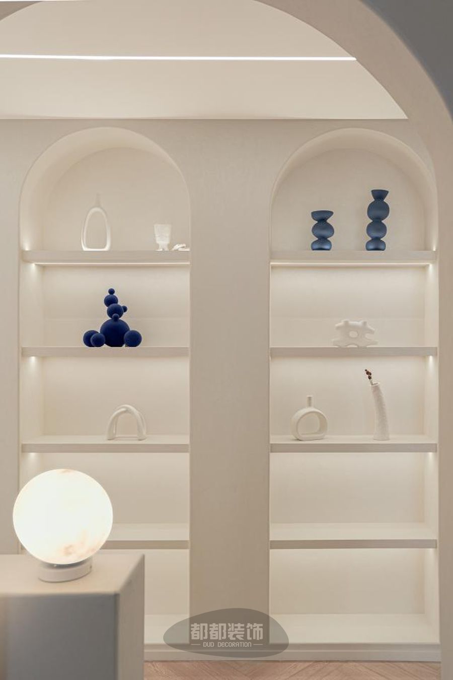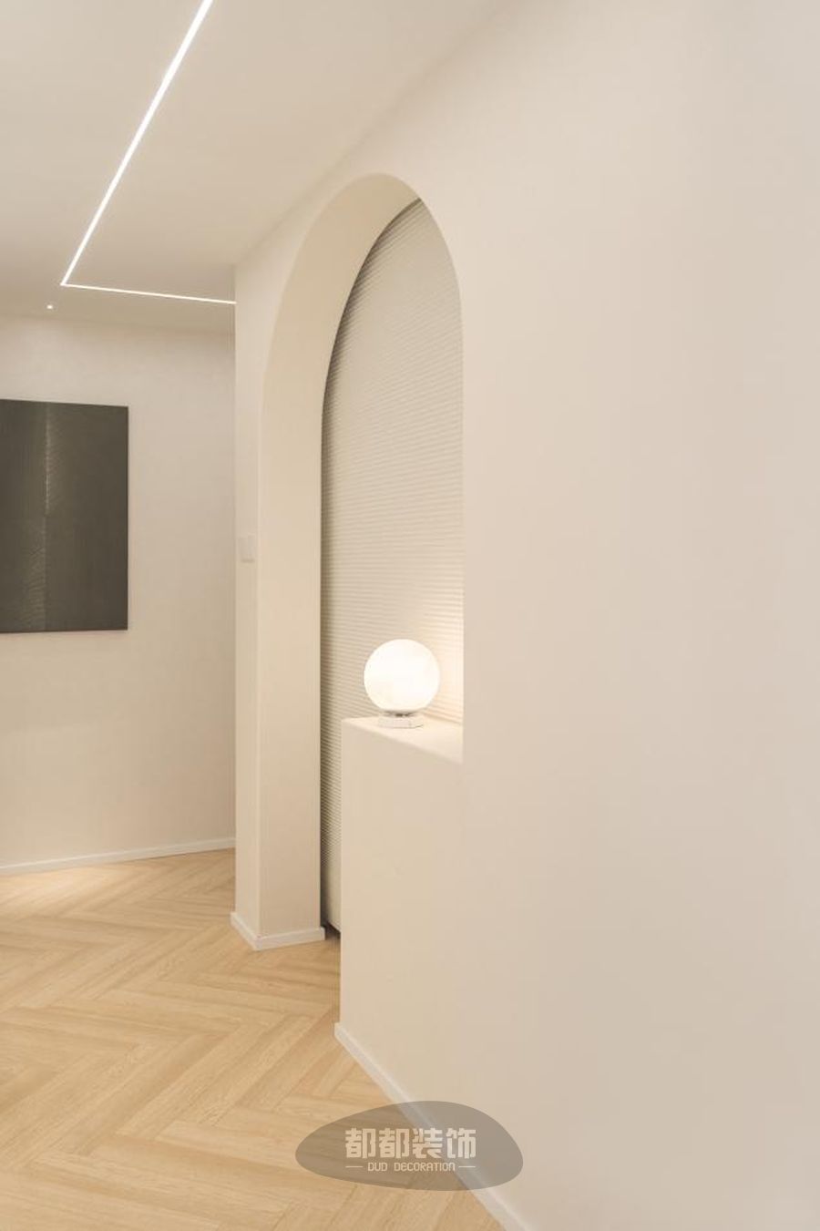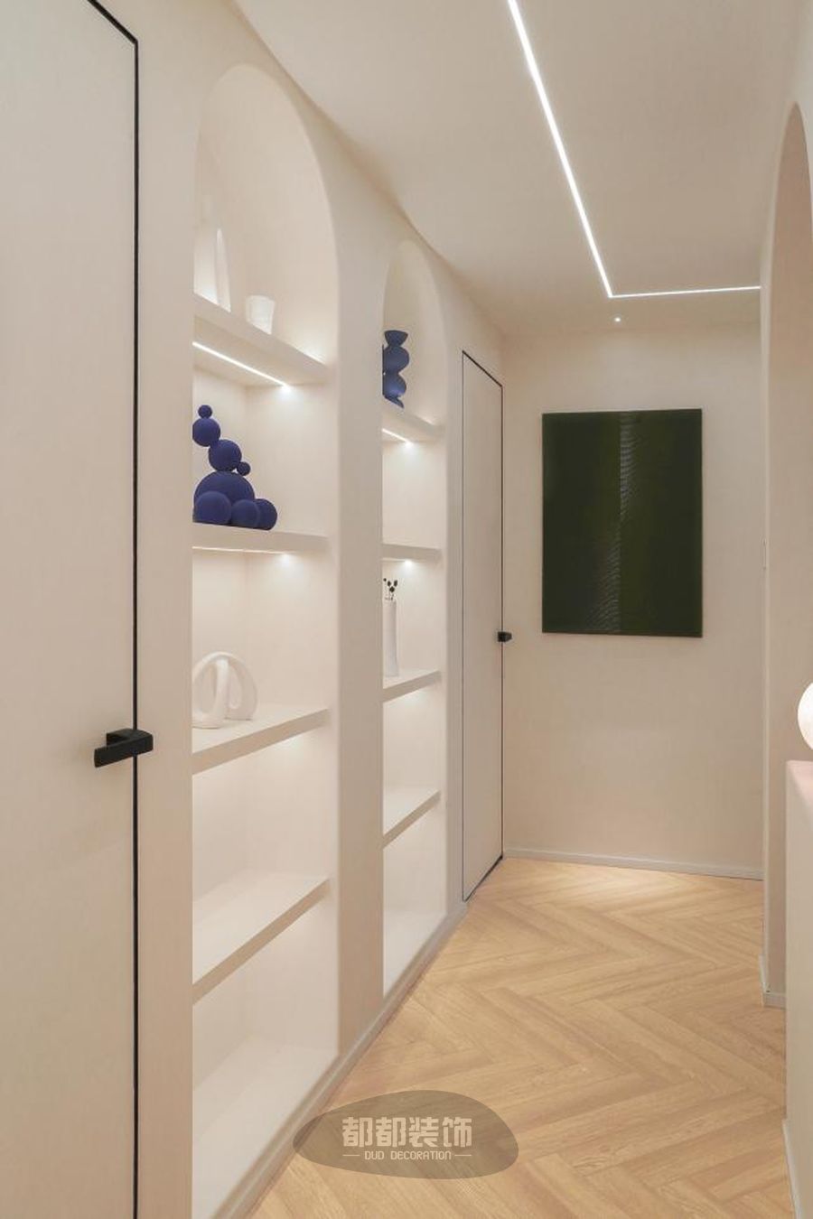 走廊一旁摆放拱形龛世储物柜,弧度流畅,不打通墙面也能打造储物空间,实现浪漫加成。