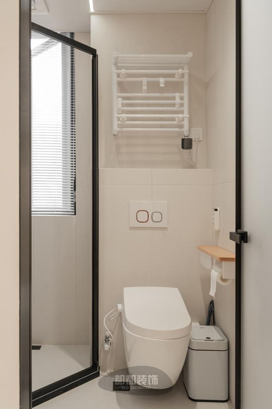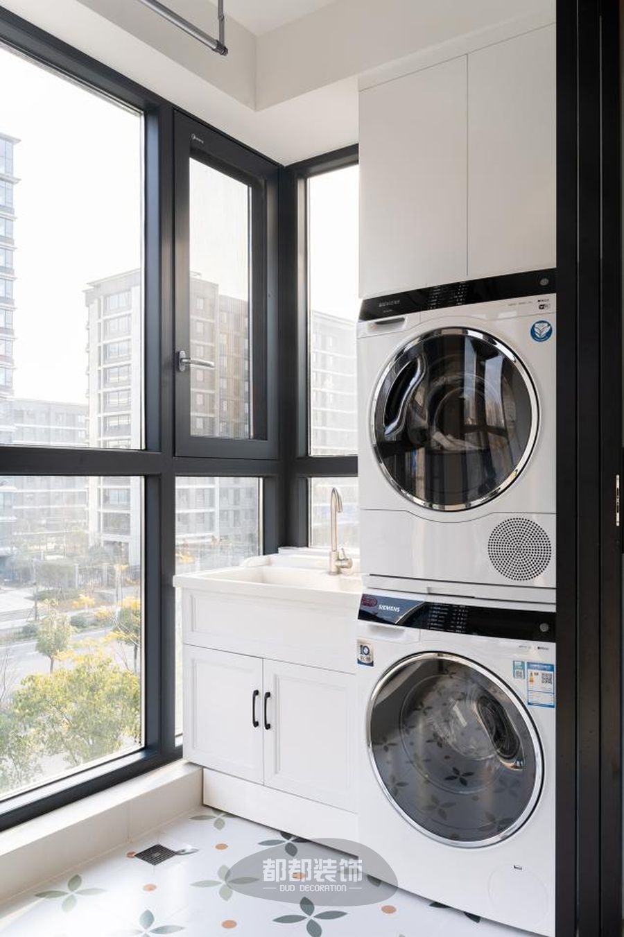 墙上吊柜设计,既不会占据过多空间,也可以增加阳台储物空间,洗衣机+烘干机+立体柜的组合搭配,令原本单调的空间变得丰富而有立体感,更有生活乐趣。