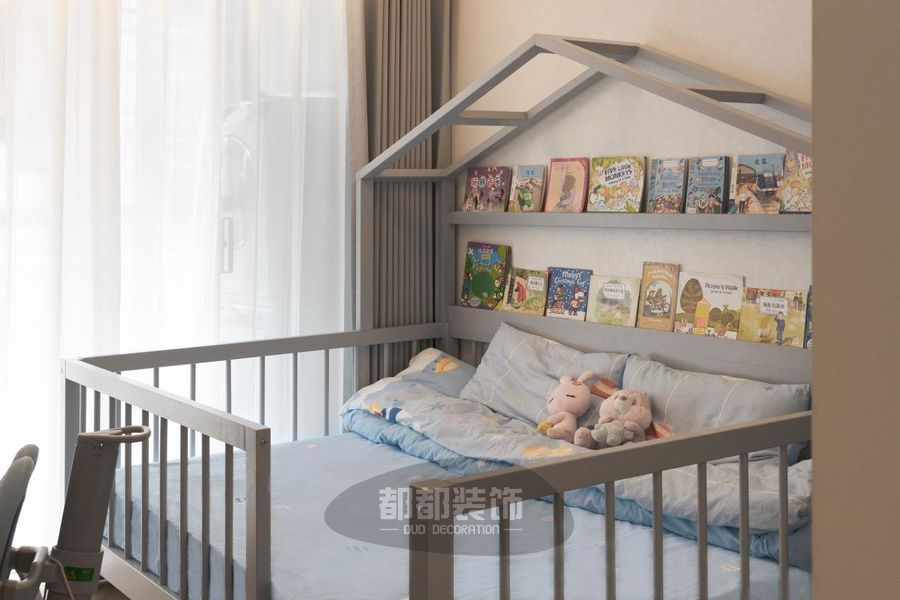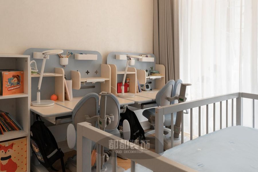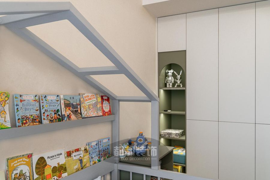 儿童房整体采用安静的蓝色结合代表纯洁美好的白色,给予空间干净明朗的通透感;双层床造型百变多样,靠墙的书架设计让孩子拥有属于自己的阅读天地。